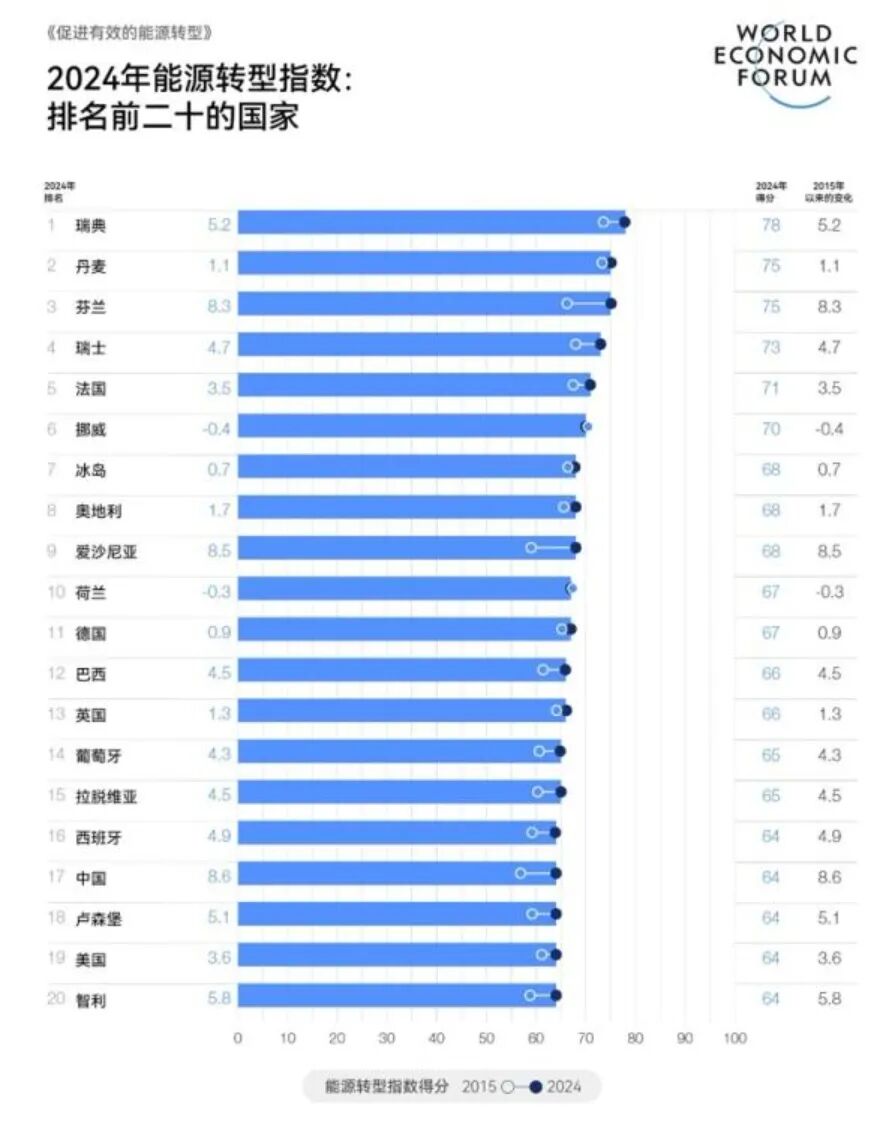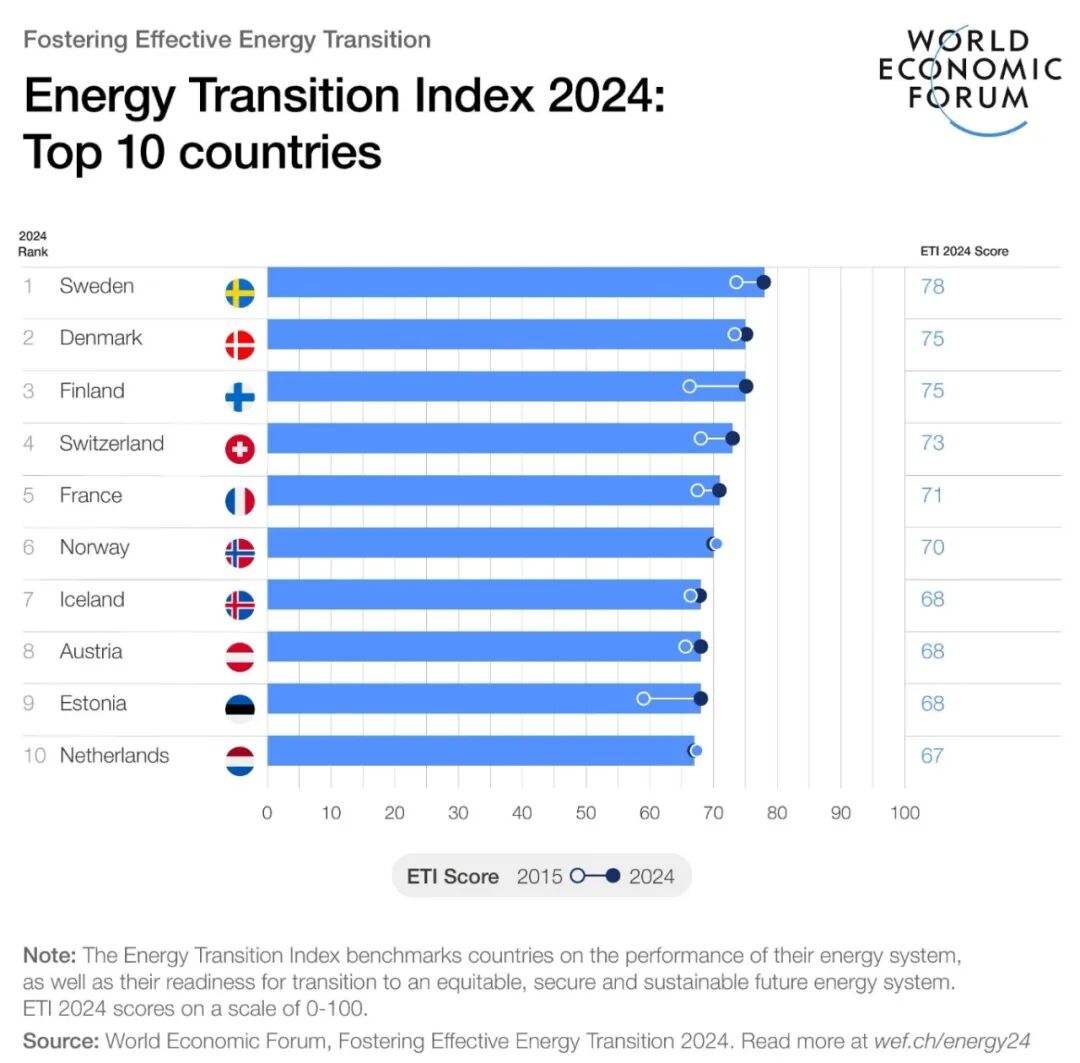 发达经济体通常是能源转型指数(ETI)中表现最好的国家,其中瑞典、丹麦、芬兰和瑞士名列前茅。与此同时,法国凭借有效的能源效率政策进入了前五名,能源强度降低了12%。