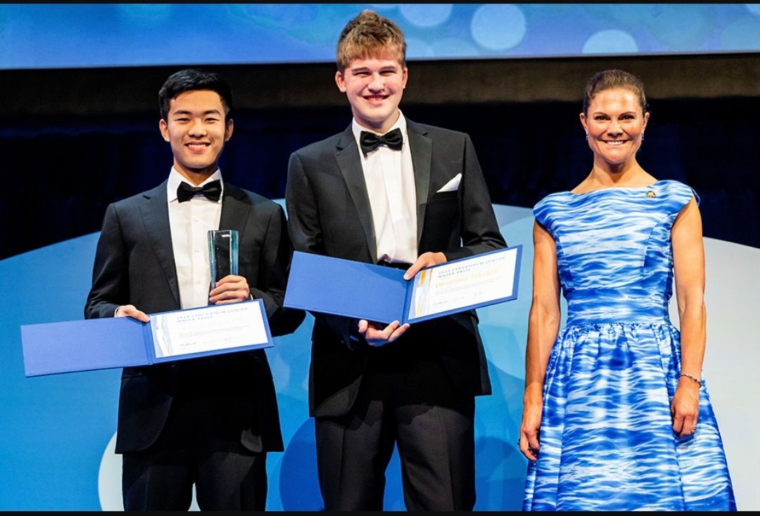 8月27日,瑞典王储妃在斯德哥尔摩海滨会议中心举行的颁奖典礼上向来自英国的Christopher Whitfield和赵文奇Wenqi(Jonathan)Zhao颁发了斯德哥尔摩青少年水奖。
