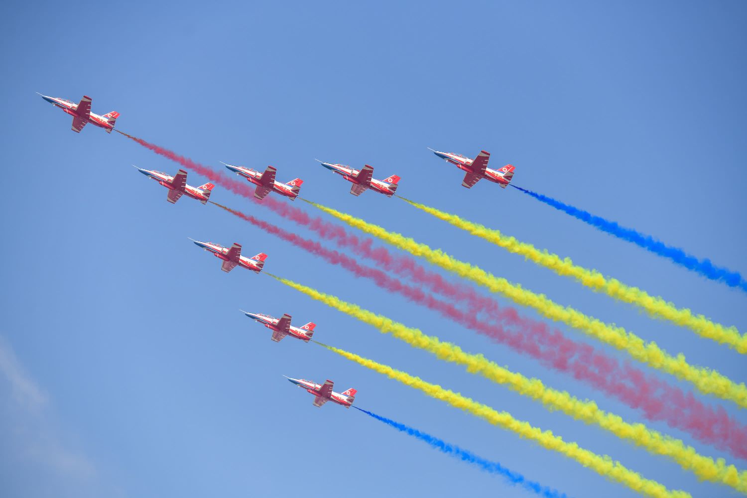 這是空軍「八一」飛行表演隊換裝殲-10C戰機後首次正式亮相中國航展。戰機分兩組編隊,一個「直衝雲霄」的動作如一把利劍劃破長空,隨後接連上演急速升空、開花、對衝、繞軸、雙機對頭交叉等動作。從躍升到散開,飛機在空中繪出完美弧線,「六機開花」「六機觔斗」、四機菱形編隊、單機連續滾轉、五機箭形隊加單機繞飛……經典動作輪番上演。