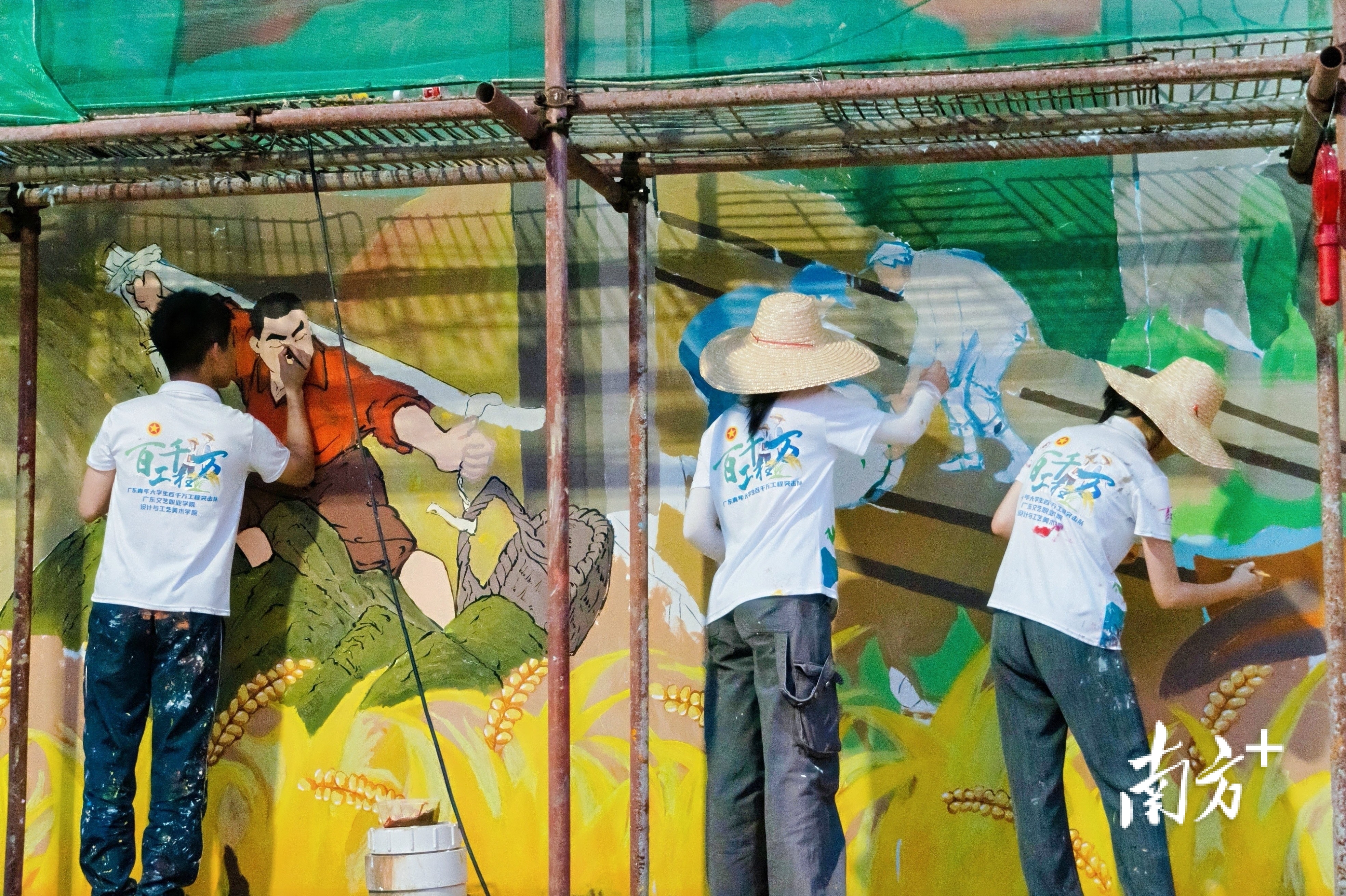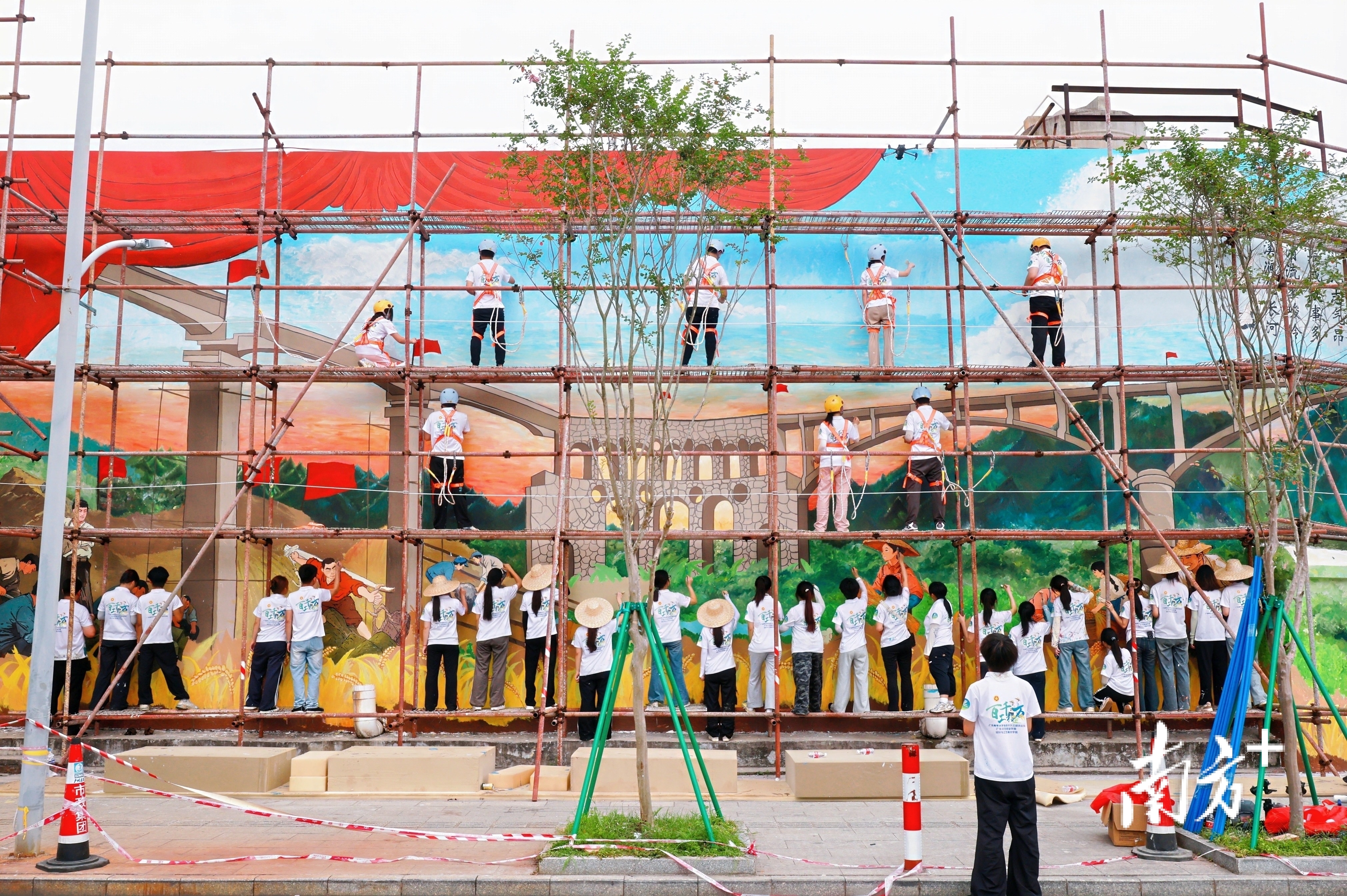 广东文艺职业学院设计与工艺美术学院党总支书记陈少炜介绍,在圩镇主轴,该学院“百千万工程”突击队绘画的33米长“红旗渠颂”大型壁画,再现了龙口镇人“战天斗地”的奋斗历程。沿街墙面上,红旗渠的壮观景象跃然墙上。同时,突击队还开发30余款融合鲜卑图腾与岭南元素的文创产品,构建出独具辨识度的古村IP。