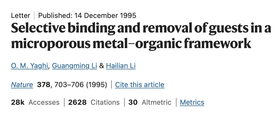 1995年,亚吉发表那篇关于金属有机框架的里程碑式的论文,文章署名除了亚吉,另外两位都是中国名字。