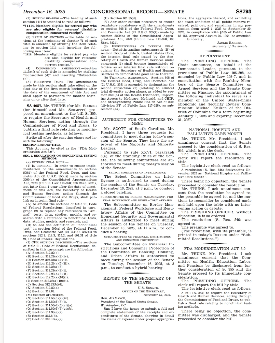 根据法案文本,FDA必须在法案成为法律后的一年内,发布过渡性最终规则,对其联邦法规汇编(Title21)中特定章节进行修改。关键修改是:将所有关于“动物”测试、数据、研究、模型的表述,统一替换为 “非临床”测试。这一措辞的转变,在法理上正式将传统动物实验与新兴技术方法置于同等地位,为后者铺平了监管道路。该法案的主要发起人、参议员科里·布克(Cory Booker)表示:“国会早在近三年前就已取消了对新药开发必须进行动物实验的法律要求。《FDA现代化法案3.0》将有助于巩固这些改革,确保FDA的法规反映现行法律和最佳可用科学。”