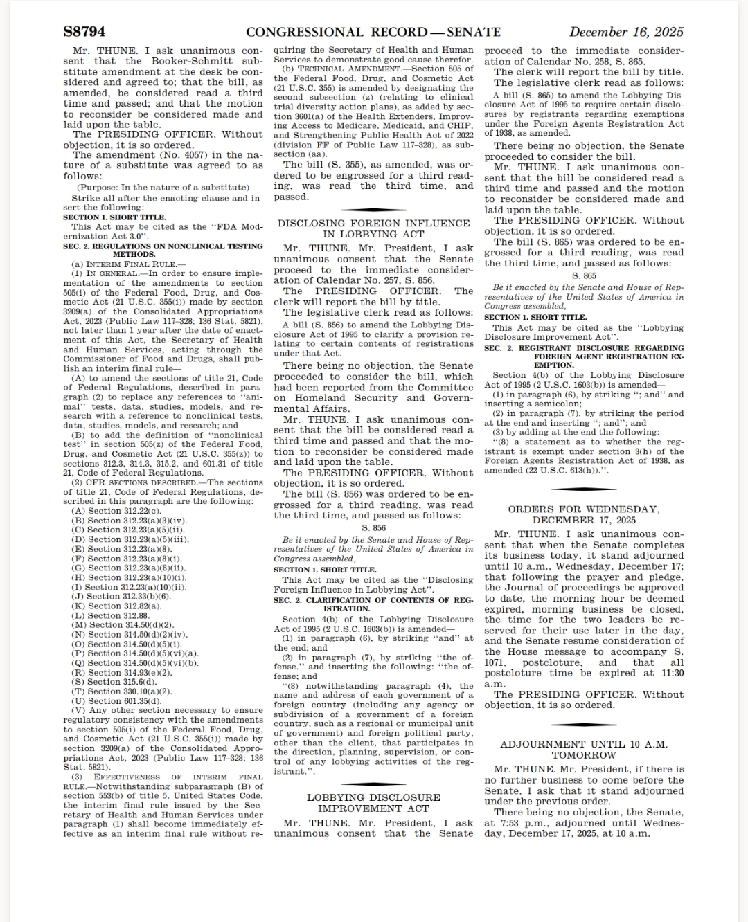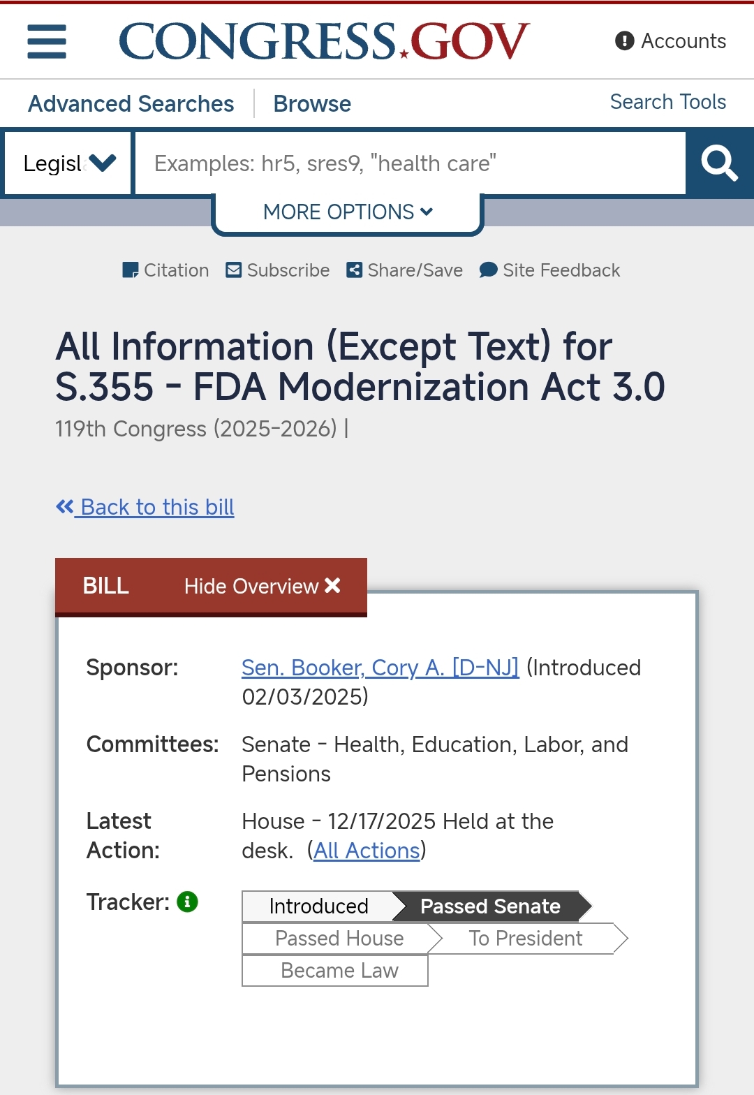 参考资料:「1」https://www.congress.gov/bill/119th-congress/senate-bill/355「2」https://www.drugdiscoverytrends.com/senate-clears-fda-modernization-act-3-0-aiming-to-align-fda-regulations-with-nonclinical-testing-reforms/