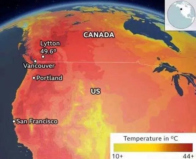 加拿大的一个高纬度地区:哥伦比亚省小镇利顿,连续三次刷新加拿大最高温,一度高达49.6℃!(这是一个比哈尔滨还靠北的地方)