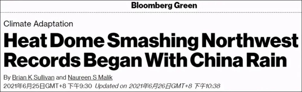彭博社的报道指出,北美高温,是因为中国下了暴雨,导致与太平洋上的暖流汇合,形成的热浪飘向了北美。
