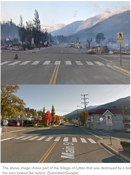 利顿90%的森林都在燃烧,成千上万的野生动物葬身火海,(利顿遭受山火袭击前后的对面图片)