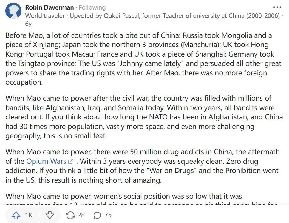 因此,基本上,对于普通中国人来说,在毛泽东之前,你很可能是文盲,在30多岁时死亡。毛泽东之后,你能识字,有一点钱,活到70多岁,你有机会结婚,有孩子,看着他们长大,自给自足。毛泽东的政府提高了中国的预期寿命,解放了妇女,实施了基本的医疗保健和教育,并为技术进步奠定了基础。这就是基本事实。任何关于毛泽东领导的讨论都应该从承认这一事实开始。