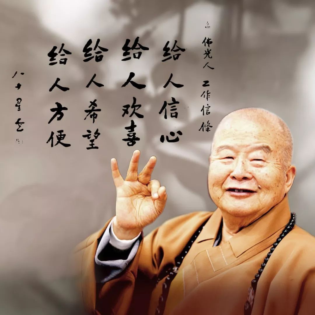 我一生,服膺于“给”的哲学,总是给人赞叹、给人满愿;我立下佛光人工作信条:给人信心,给人欢喜,给人希望,给人方便。因为我深知结缘的重要,心里只想到处结缘、到处散播佛法种子。我立志兴办各种教育,因为从小我没有进过正规的学校读书,明白教育才能提升自我,改变气质。我也发心著书立说,因为从佛陀那里一脉相承的法水流长,我不能不把心里的泉源用来供应世间。