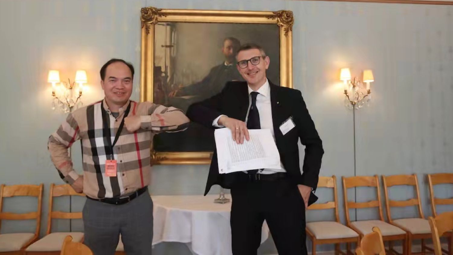 北欧时报总编辑何儒在瑞典皇家科学院采访化学奖评委,这是皇家科学院办公楼会议室,背景是诺贝尔的画像。/北欧时报 资料图