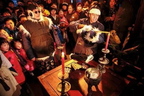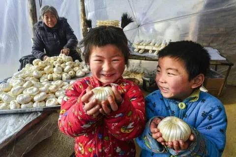 ▲二十三,糖瓜粘。糖瓜既可祭灶,也可吃。图为山东高唐县小屯村糖瓜店吃灶糖的小朋友。到了腊月二十三日午夜,该送灶王爷了。通常是由主祭人带领着,全家一起走进厨房,在灶王位前肃立,上香礼拜。按长幼尊卑,每人给灶王爷叩首三次。主祭人朗读《灶王经》等祭文,求灶王爷保佑。这时香烛快燃烧尽了,讲究的话,再依次磕三个头。然后,把糖瓜儿、酒糟抹在灶王的嘴边。这叫“粘灶”和“醉司命”,灶王吃糖或酒醉,肯定说好话了。这时再把灶王爷从墙上“请”下来,带到院子里。在院子里找来钱粮盆,即烧纸马的大铁盆,将金银元宝、料豆都放进去,架着松枝一起点燃。之后,进屋对着没了灶王爷的灶作个揖,便是全部礼成。