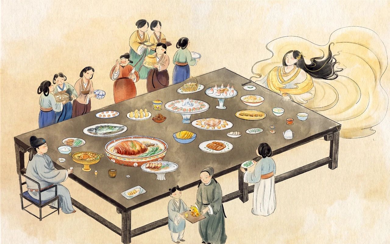 ▲ 化身为美女的灶神,虽然不为人们所见,却每天和人们一起享用大餐。绘画/喵9