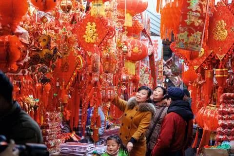 ▲小年到,办年货。图为河南省开封市大相国寺市场,人们正选购过年用的福字挂饰,迎接新年的到来。