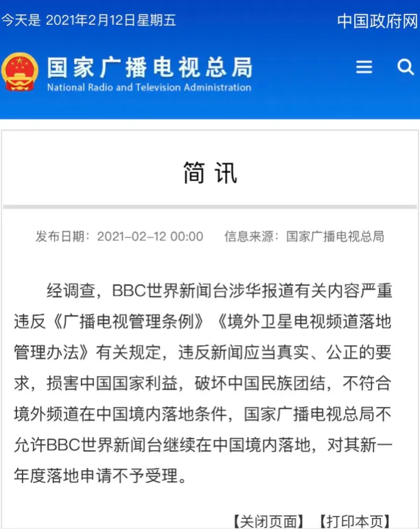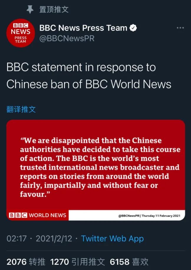 能让中国官方出面制裁的外国媒体机构极少,因为我们的政策主基调是欢迎外国人访华,尤其欢迎外国的媒体朋友访华,但BBC享受了中国针对性制裁的顶格待遇。在被中国官方制裁后,BBC当天就发了一份全球声明,写的是:“BBC是全球最受信任的新闻机构,我们公正公平地报道全球事件,没有任何畏惧或讨好。”