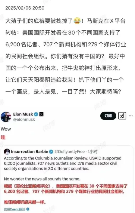 但马斯克掐断USAID的500亿美元后,仅仅几天之内BBC就立场大改,从极端反华瞬间变成了极端亲华,进行了极其极端化的态度转变。这就是每年几千万美元的威力,能把BBC的腰杆折来折去,随便扭成任何形状。而每年从USAID收钱的可不止这几家欧美大媒体,USAID在足足30个不同国家支持了6200名记者、707个新闻机构和279个媒体行业的民间社会组织,此事已经公开报道,并得到了马斯克的转发确认。