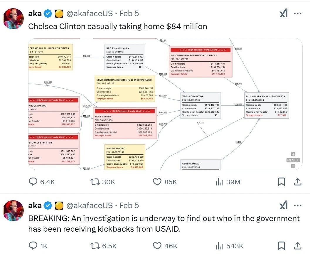 马斯克核查USAID的相关爆料,正与多家美媒开打重大遭遇战。第一场堡垒战是关于克林顿家族从USAID拿走8400万美元的丑闻爆料,美国主流媒体几乎倾巢出动。其中,《新闻周刊》发表了《事实核查:切尔西·克林顿从美国国际开发署拿走了8400万美元吗?》,做出结论并引证希拉里的话加以证明:“错误。切尔西·克林顿至少自2013年12月结束的财政年度以来没有因她在基金会的工作而获得任何报酬。美国国际开发署提供8400万美元资金的说法也是错误的。希拉里·克林顿曾表示,她的家人‘没有从这项工作中赚到任何钱’。”