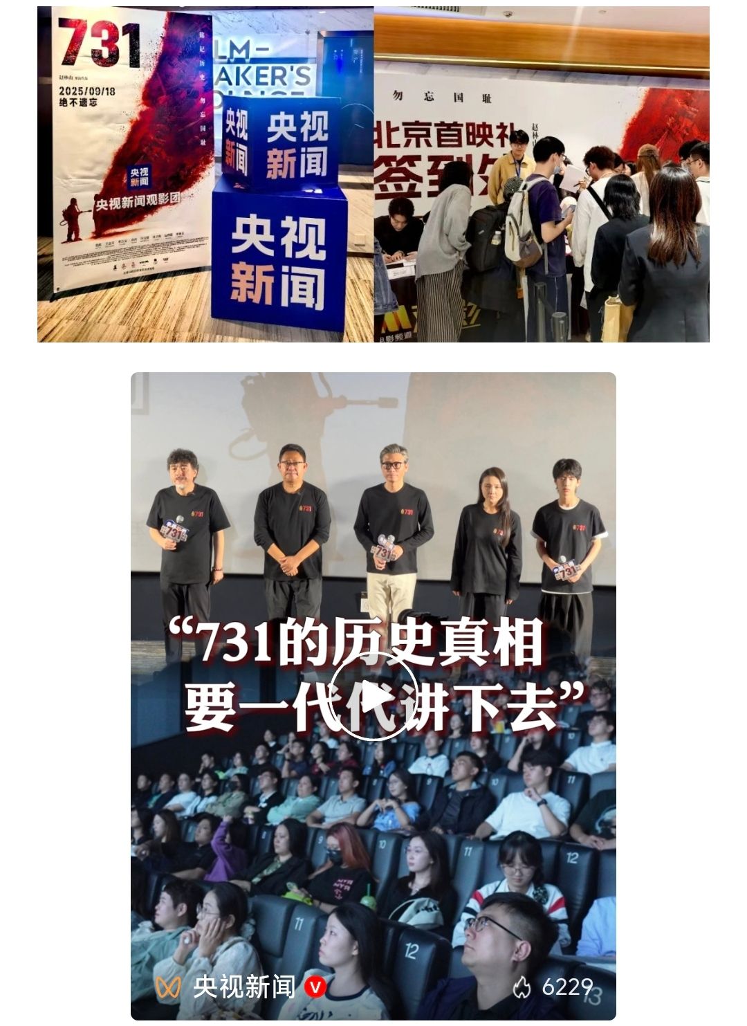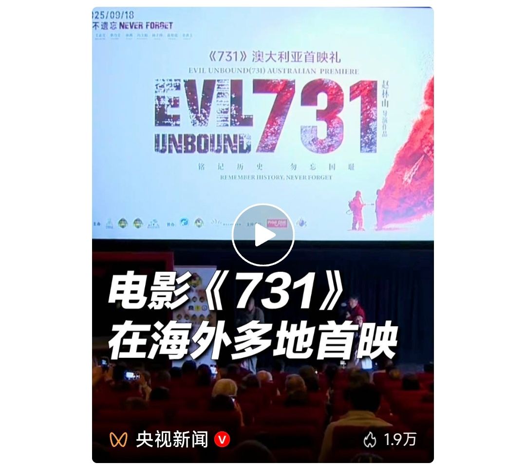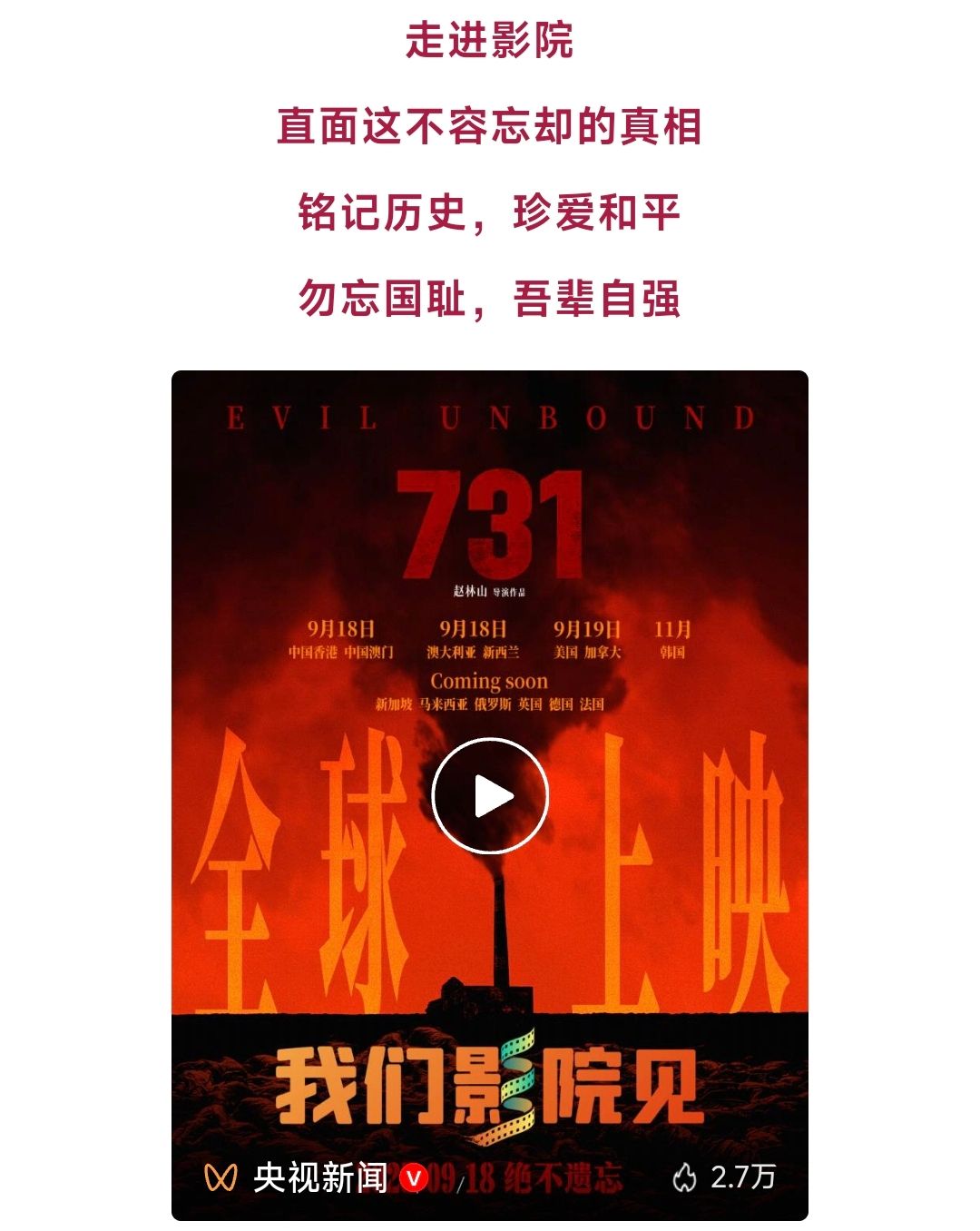 9月18日,电影《731》在全球多地首映。当天,央视新闻举办了《731》专场观影活动。据网络平台数据,截至9月19日20时30分,电影《731》总票房(含预售)已超6.6亿元。