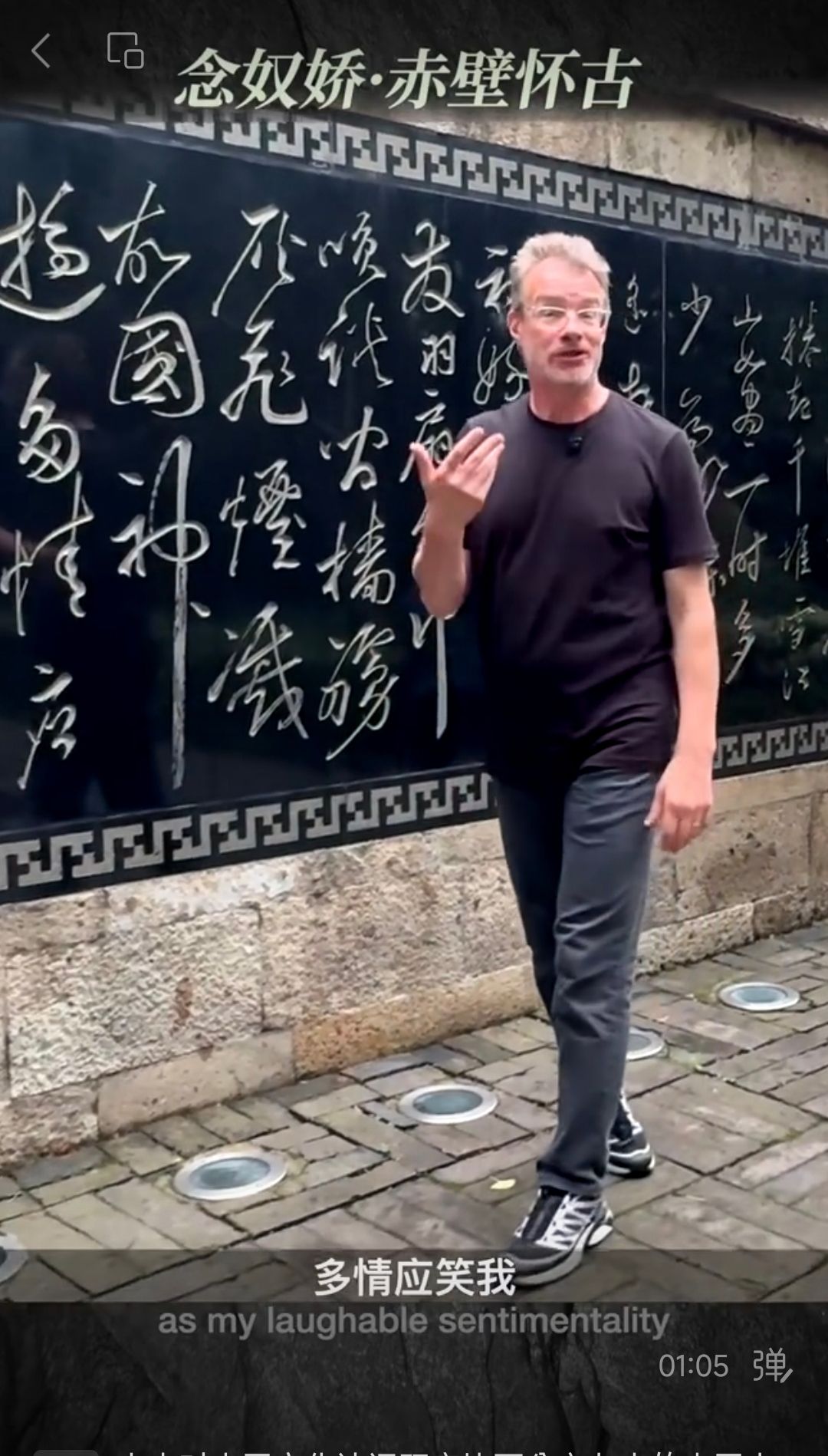 在北欧寒凉的石街上,忽然从天际飘来加拿大著名跨文化学者——大山先生“醉后”朗诵苏轼的《念奴娇·赤壁怀古》。他的语调高昂,神情恍若千年前的东坡再世。那一刻,风似带着江水的味道,诗的回响穿越了国界,也穿透了人心。