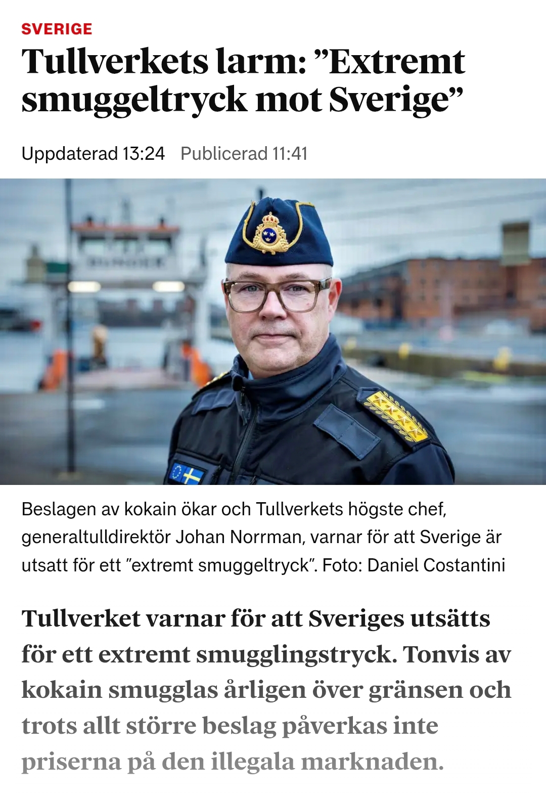 Sveriges generaltulldirektör varnar för att landet nu står inför ett”extremt smugglingstryck”.Trots rekordbeslag av kokain påverkas inte gatupriserna,vilket visar att volymerna som når Sverigeär långt störreän vad myndigheterna hinner stoppa.