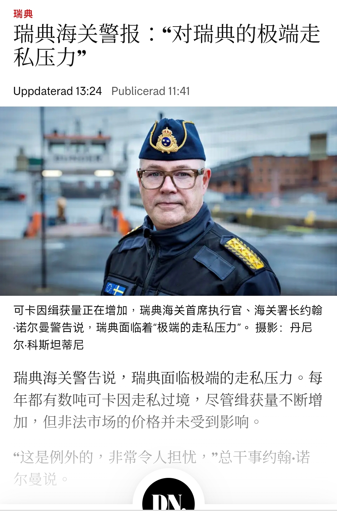 瑞典海关总监近期公开表示:瑞典正遭受“极端的毒品走私压力”。尽管每年截获吨级可卡因,但街头毒品价格却未上升——说明流入规模远超执法阻断能力。