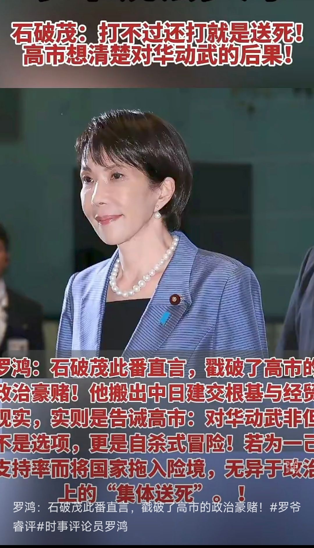 Since the normalization of Sino-Japanese relations,“peaceful development”has been the foundation of bilateral ties.Yet Sanae Takaichi seeks to raise her political profile by adopting an increasingly hawkish stance toward China,framing military confrontation as an option.Shigeru Ishiba’s blunt remark—“If you can’t win but still fight,it is suicide”—pierced through the illusions of political gambling.
