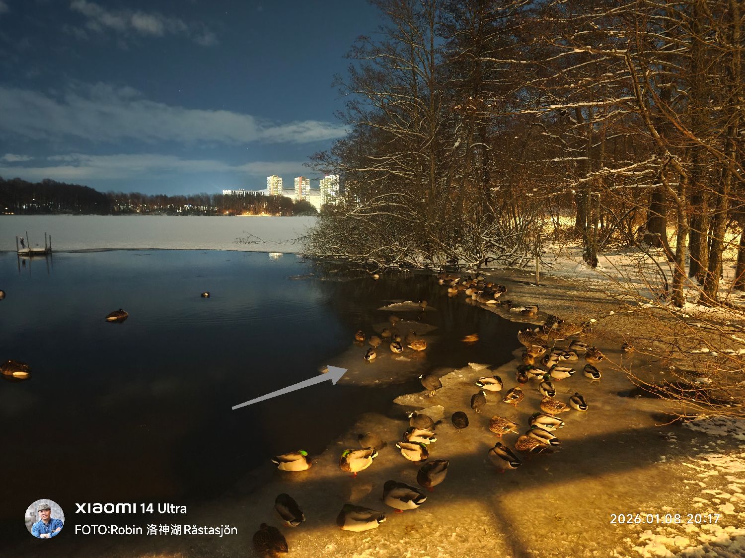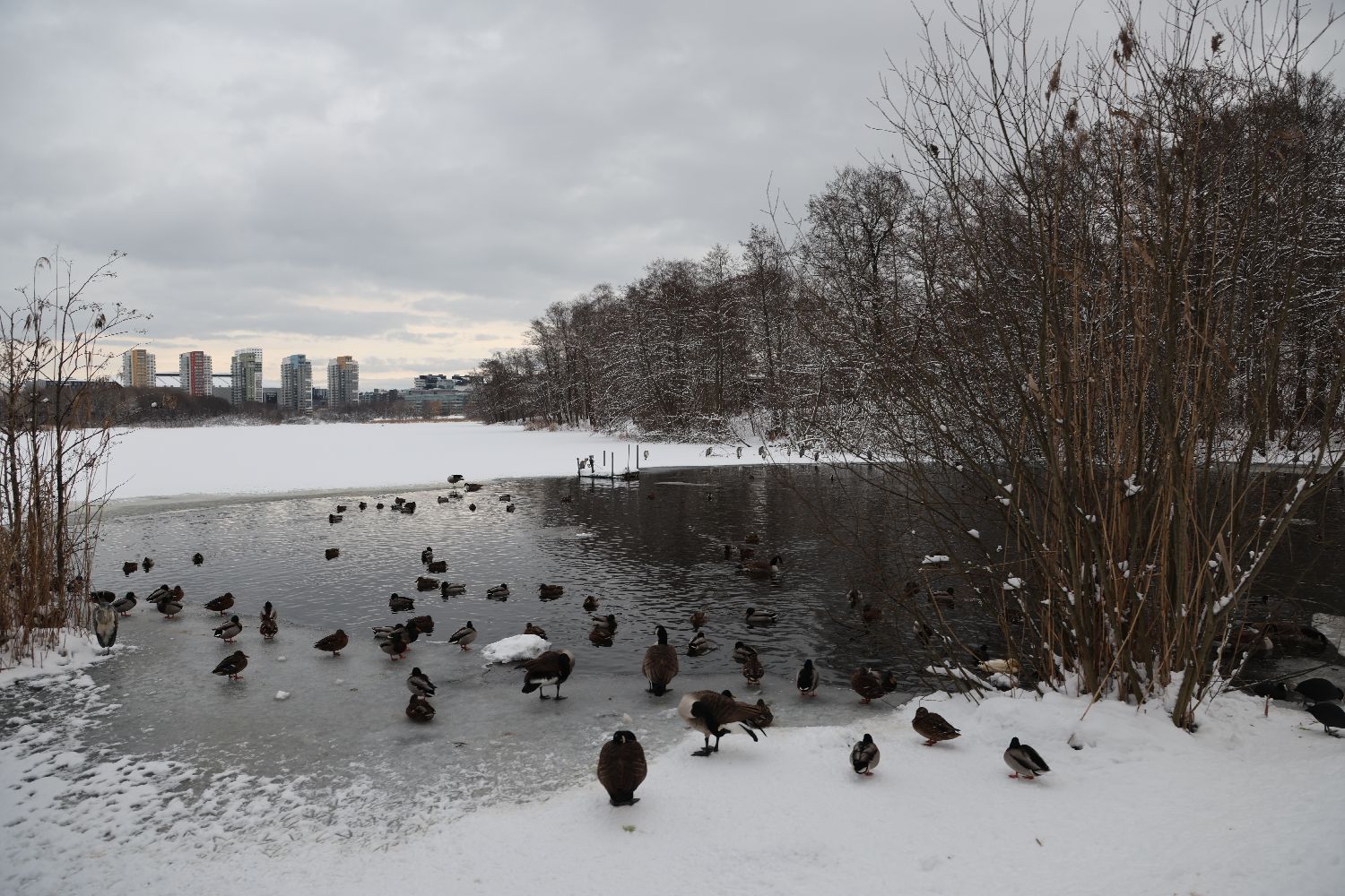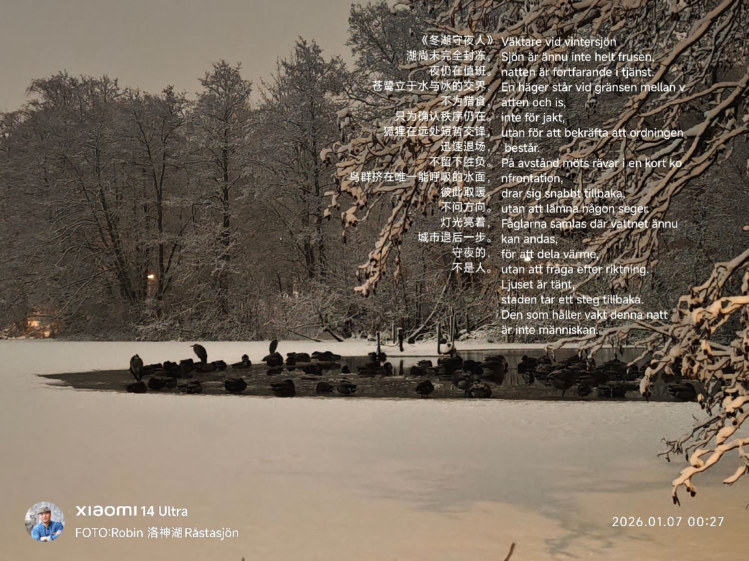 En vinterkväll vid Råstasjön,när isenännu inte har lagt sig helt,samlas vattenfåglar tätt intill varandra påen smal strimmaöppet vatten.De trängs inte,de konkurrerar inte.Några småänder låter sig till och med glida fram påett isflak,lugnt och nästan lekfullt,mitt i kylan.