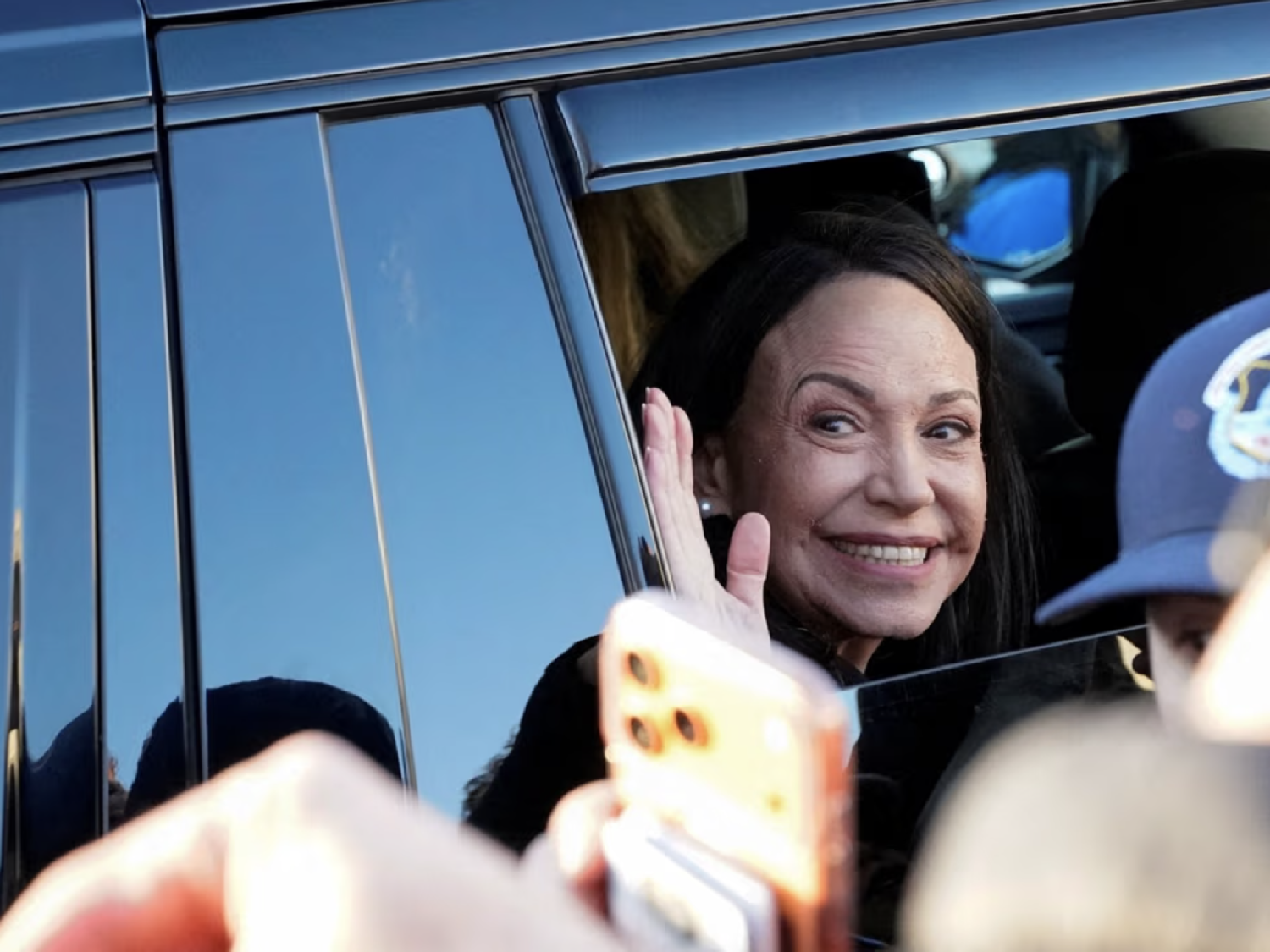 María Corina Machado vilkutti kansalaisille poistuessaan tapaamisestaan presidentti Donald Trumpin kanssa Washington D.C.:ssätorstaina.