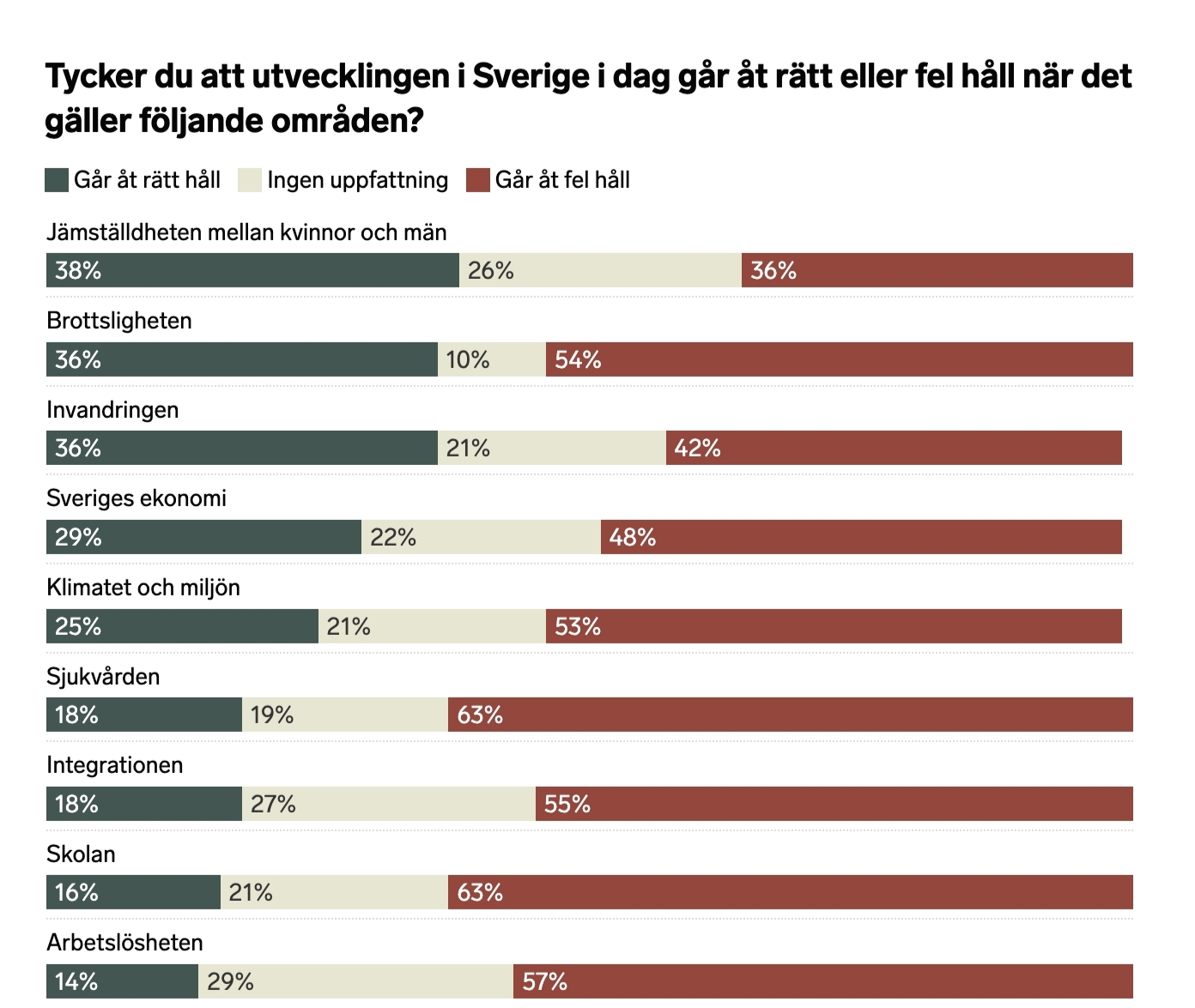 En ny opinionsundersökning från Ekot/Indikator visar att en majoritet av svenskarna anser att utvecklingen gåråt fel håll inom flera centrala områden–sjukvård,skola,brottslighet,integration och ekonomi.Dettaär inte bara siffror,utan ett uttryck för en djupare samhällelig omvärdering.