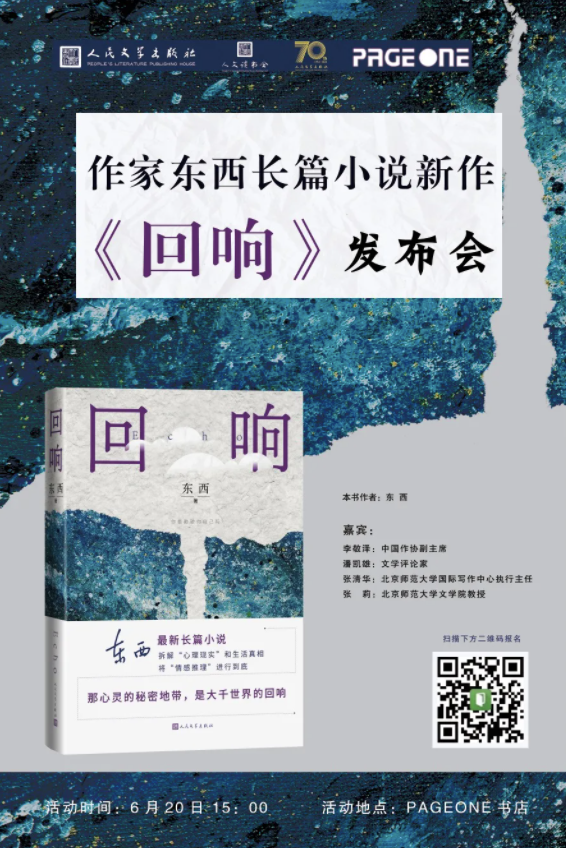 6月20日(周日)下午三点,作家东西将携新书《回响》在PAGEONE北京坊店与期盼已久的读者见面。届时,东西将与中国作协副主席李敬泽、文学评论家潘凯雄、北师大国际写作中心执行主任张清华和北京师范大学文学院教授张莉一起,聊聊《回响》和背后的故事,聊聊文学创作与时代发展。