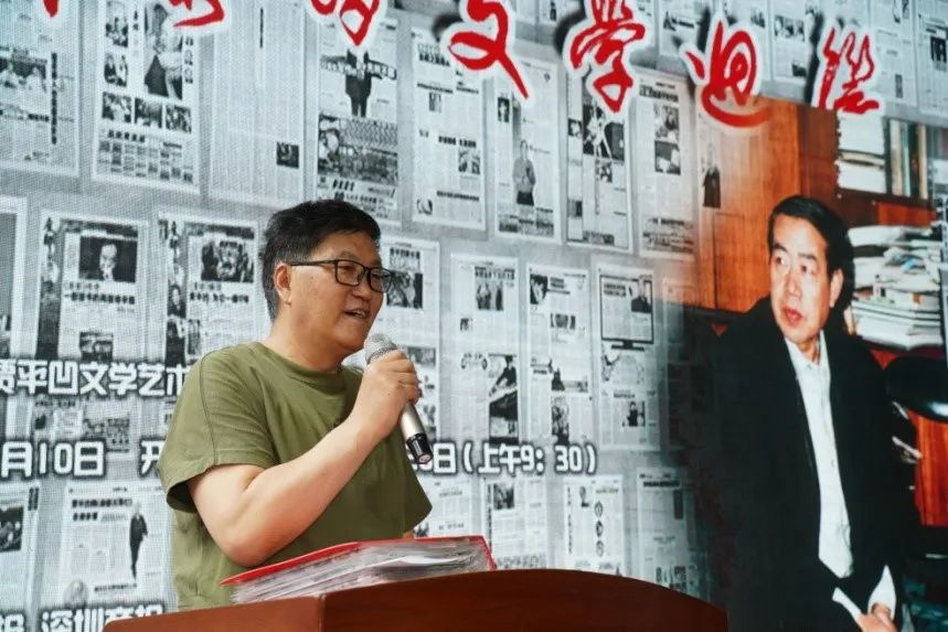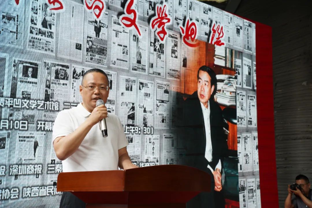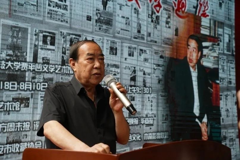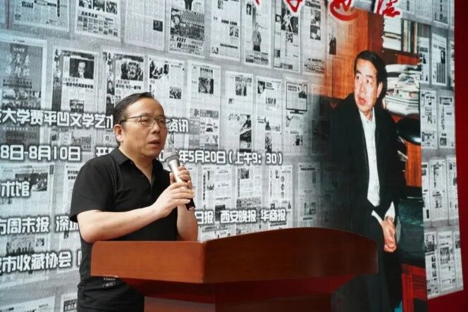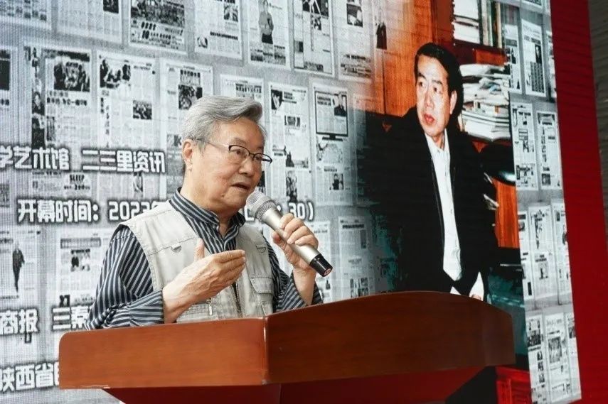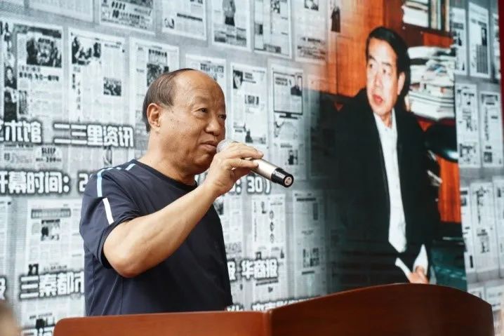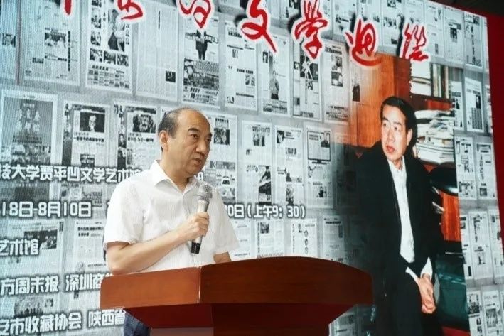 (著名学者肖云儒)肖云儒致辞说,借此展览致敬贾平凹,致敬老报人和传媒人。作家有三重形象,一是人生的贾平凹;二是文学艺术家的贾平凹,三是社会的贾平凹。这三重形象通过传媒和读者参与其中,三重打造,使得贾平凹这个文学符号成为当代中国文学史和陕西文化版块中一个非常重要的现象。