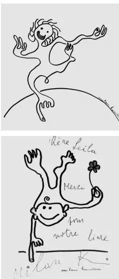 出于谨慎,昆德拉更愿意给人寄送手绘图画而不是信件。他以毕加索版巴巴爸爸的方式画一些奇怪的人物,一些线条柔软圆润的形象。蕾拉·斯利玛尼家中就装裱着一幅昆德拉用儿童体签着“MilanK”的装饰画,字母i上的圆点被点缀成花蕾形状。