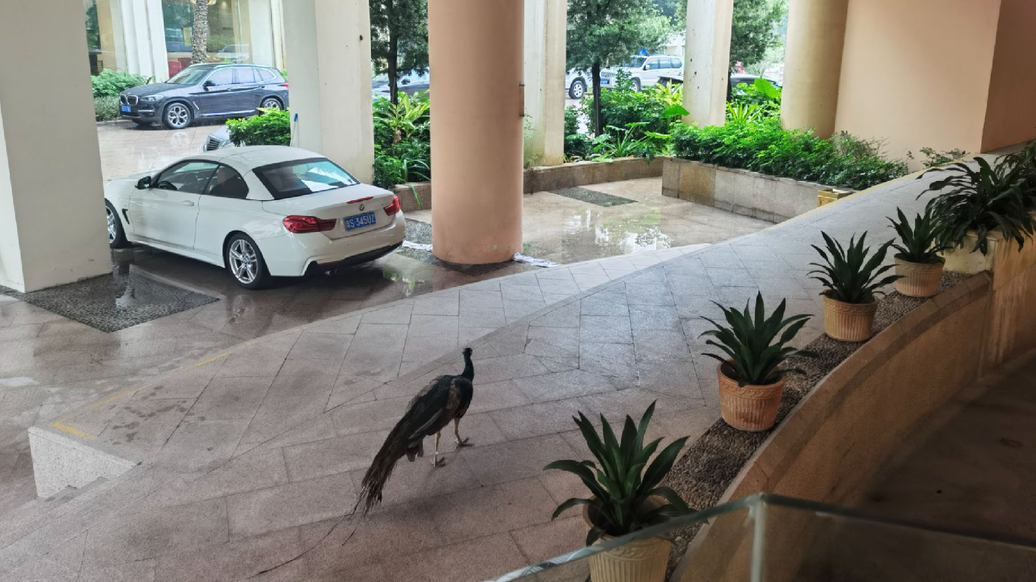 我也忙里偷闲,饭后散步御景湾,正要避雨时,偶遇孔雀飞来眼前,摆着长毛,仰着漂亮的头冠,左顾右盼,似乎在给我指路,又似欢迎远道而来的贵客。据外地人说,东莞人杰地灵,物华天宝,人善又勤俭,虎英山这一带不知什么时候飞来一群漂亮的金凤凰(孔雀),由于生态环境优美,当地百姓对动物保护意识又非常强,久而久之,这些吉祥鸟就不愿意飞走了,年复一年,生养众多,共同护佑着这片宝地。