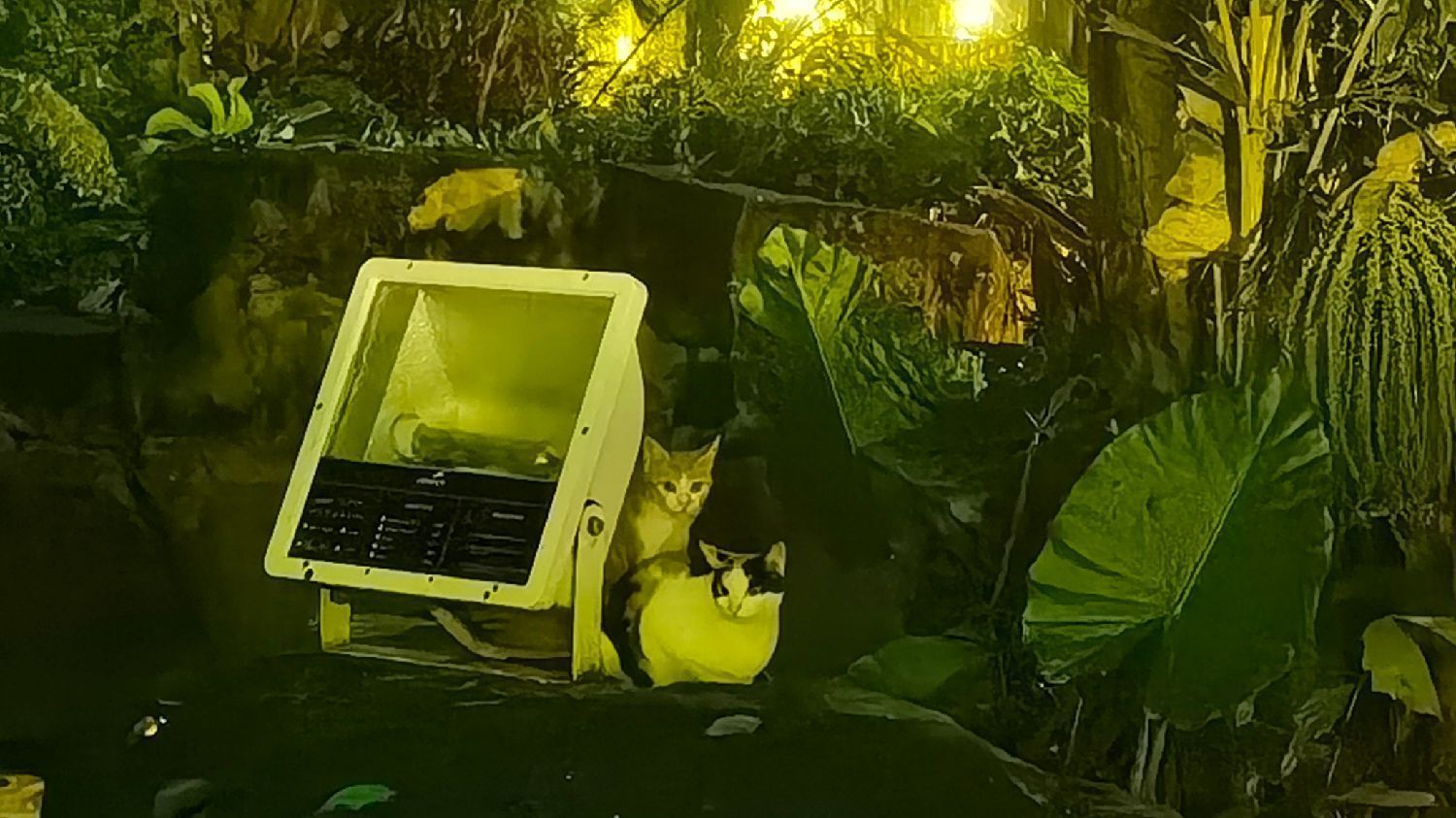 夜间散步在林间,发现两只可爱的小猫,一会躲在灯下,一会溜到石头上,愣愣的看着我[偷笑]。/北欧时报图