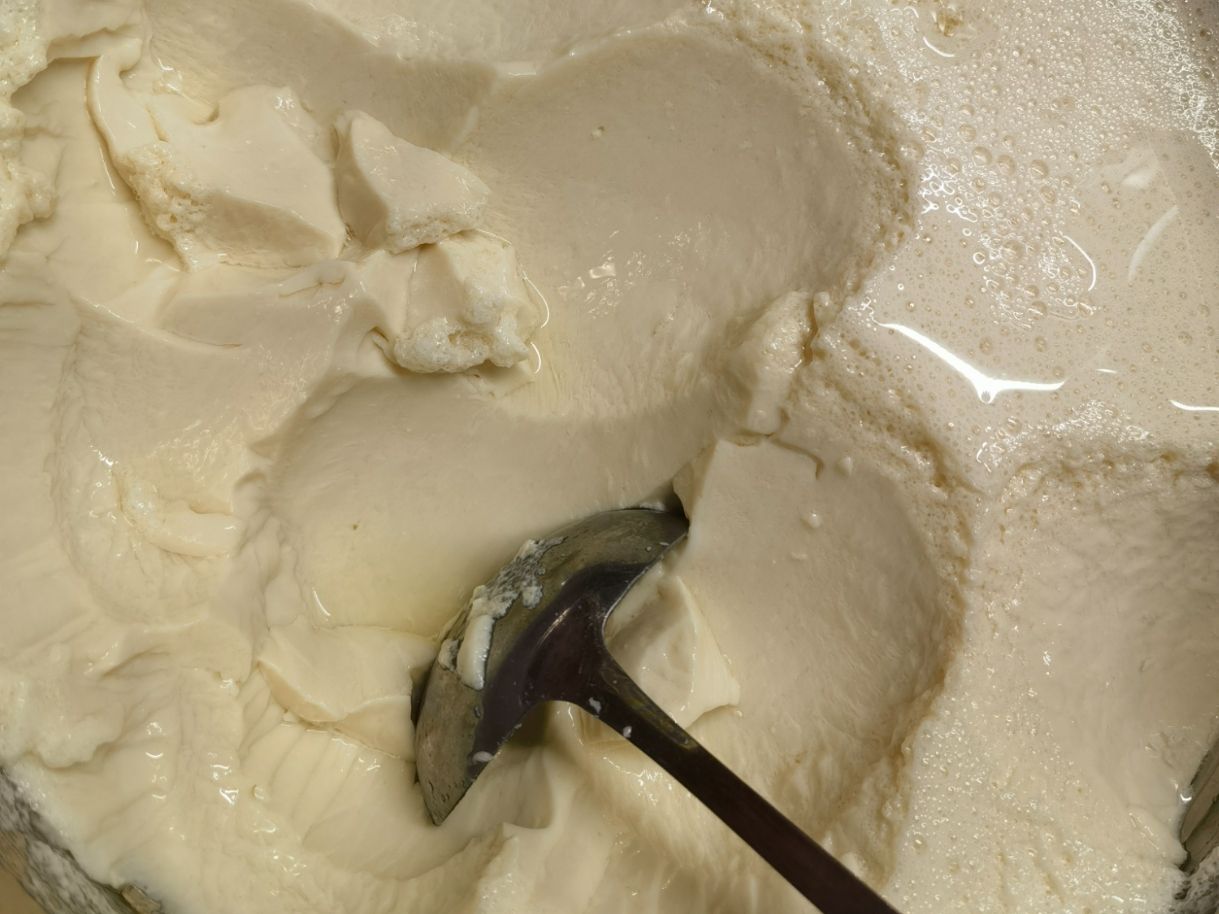 制作豆腐是个技术活,要经历制作豆浆、压模成型等多道复杂的程序。制作豆浆又包括挑选黄豆、浸泡黄豆、磨黄豆、煮豆浆等多个环节。挑选黄豆的关键是要懂得分辨黄豆的好坏,质地好的黄豆圆润饱满,颜色鲜黄,这个过程中最为重要的是要把霉烂的黄豆选出来,不然会影响豆腐的质量。接下来是浸泡黄豆,母亲会在头天晚上就提前把挑选好的优质黄豆用清水浸泡上,浸泡时间要够才能充分将黄豆泡透,冷天需要10小时以上黄豆才能充分泡透,而在热天,还需要勤换水,2、3个小时换一次水,防止豆子泡酸了。母亲说,心急吃不了热豆腐,心急也做不出好的豆腐。第三个环节磨豆浆。天刚亮就要起来把泡好的黄豆磨成豆浆,那时磨豆浆都是人工小石磨,一个人右手推磨,左手往磨眼里投放黄豆和水,黄豆和水的比例很讲究,大约按照1斤黄豆加8、9斤的水。推磨是个体力活,需要技巧和耐力。豆浆磨好后就到第四个环节--过滤,磨好的豆浆需用棉布袋滤掉豆渣。虽然石磨磨得很细,但还是有渣,必须将豆渣过滤出来,这个非常重要,不然也会影响到豆腐的质量。过滤好的豆浆是制作豆腐、饮用豆浆、腐竹、豆腐粥的原料,到这里就完成了做豆腐的前期准备。