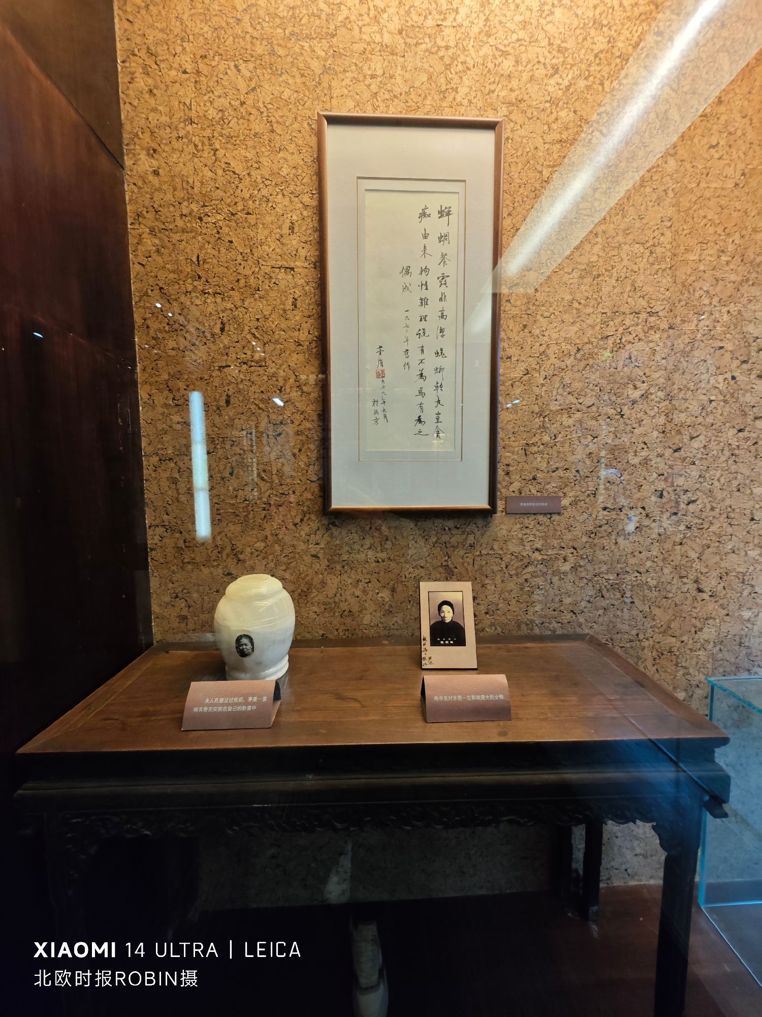 茅盾纪念馆陈列室有这么一处文物:左边是茅盾夫人的骨灰盒,文字:夫人孔德沚过世后,茅盾一直把她的骨灰安放在自己的卧室中。