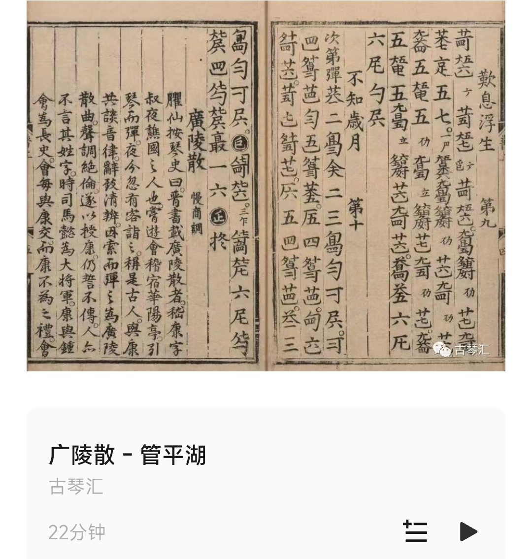 又名《广陵止息》,乐曲原是东汉末广为流传的民间音乐,被推测为以战国时期聂政刺韩王为题材的大型器乐叙事曲.它以磅礴的气势,独特的风格,庞大的结构,表现了一种慷慨激昂的英雄气概,受到琴家们的推崇。