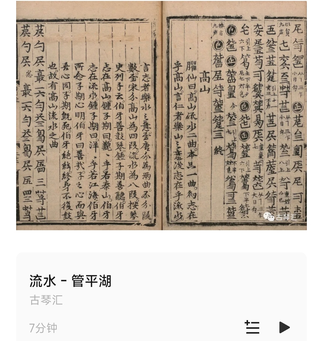根据《神奇秘谱》记载:高山、流水二曲,本只一曲,至唐,分为两曲,不分段数。可见,“高山流水”、“高山”、“流水”三曲实出于同一首琴曲,但传谱至今仅见《高山》、《流水》两谱,现存《高山流水》琴曲则是以存见的《高山》、《流水》两曲合编而成,已非古曲。