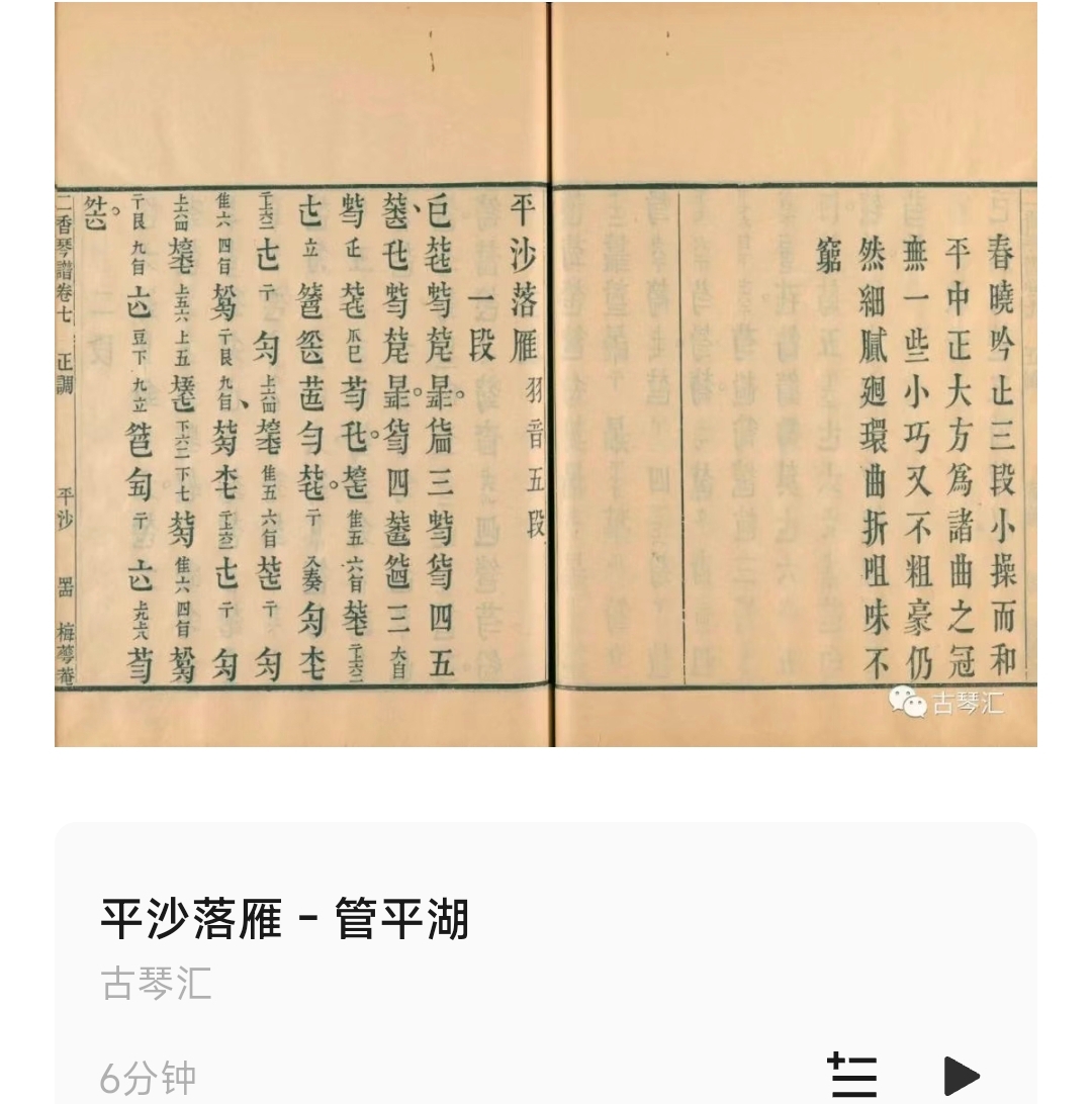 古琴十大名曲之一。明朝此曲称《雁落平沙》。曲调悠扬流畅,通过时隐时现的雁鸣,描写雁群降落前在空际盘旋顾盼的情景。