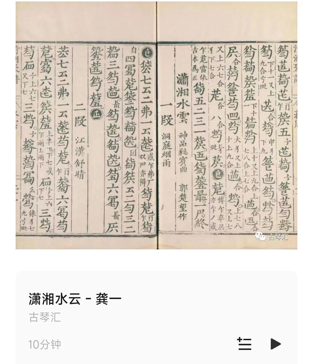 曲谱最初见于《神奇秘谱》,共分十段:1、洞庭烟雨2、江汉舒清3、天光云影4、水接天隅5、浪卷云飞6、风起云涌7、水天一碧8、寒江月冷9、万里澄波10、影涵万象。