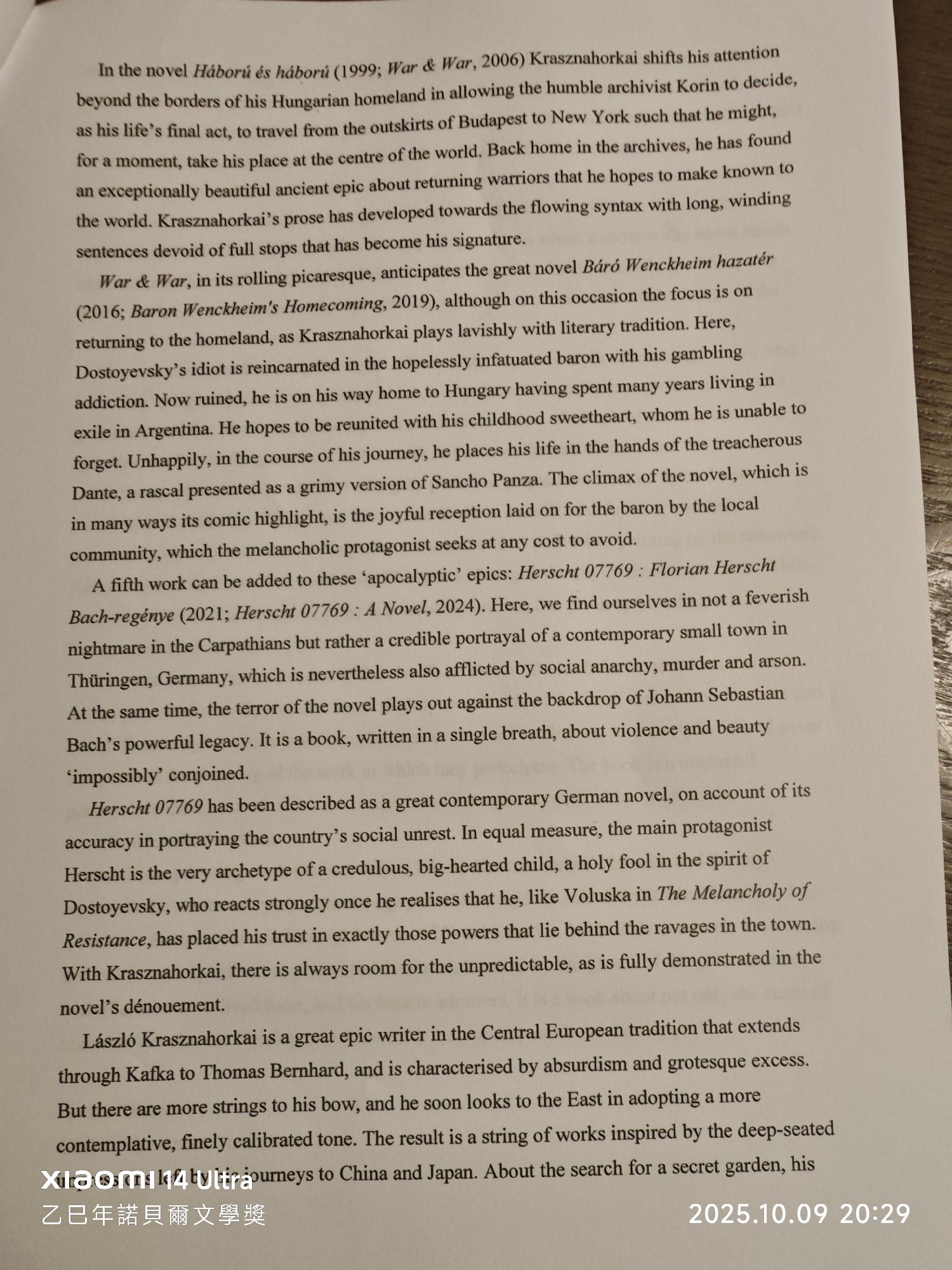 Wood,James,“现实被审视到疯狂的地步:LászlóKrasznahorkai”,载于《有趣的东西和其他论文》。–纽约:法勒、施特劳斯和吉鲁,2012年