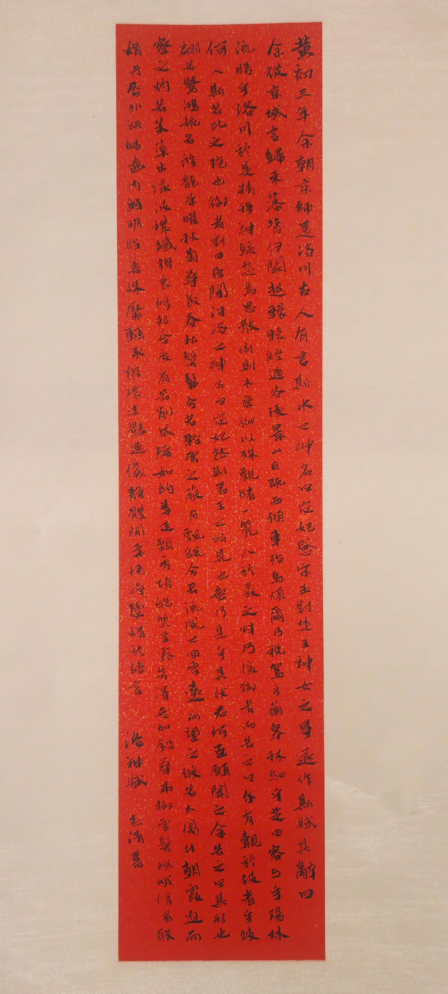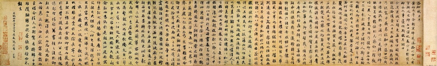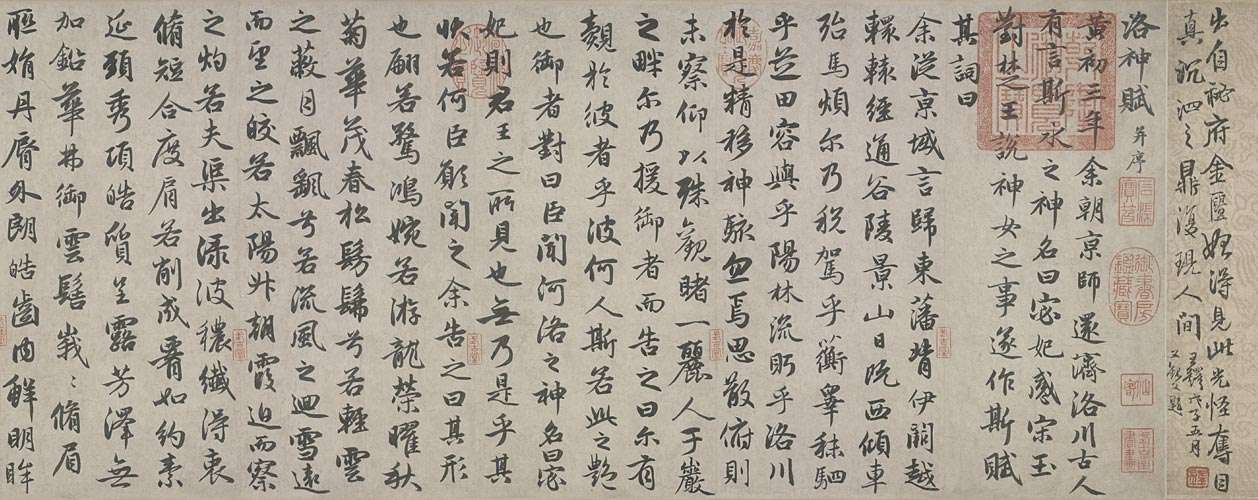 余從京域,言歸東藩。背伊闕,越轘轅,經通谷,陵景山。日既西傾,車殆馬煩。爾乃稅駕乎蘅皋,秣駟乎芝田,容與乎陽林,流眄乎洛川。於是精移神駭,忽焉思散。俯則未察,仰以殊觀,睹一麗人,於巖之畔。
