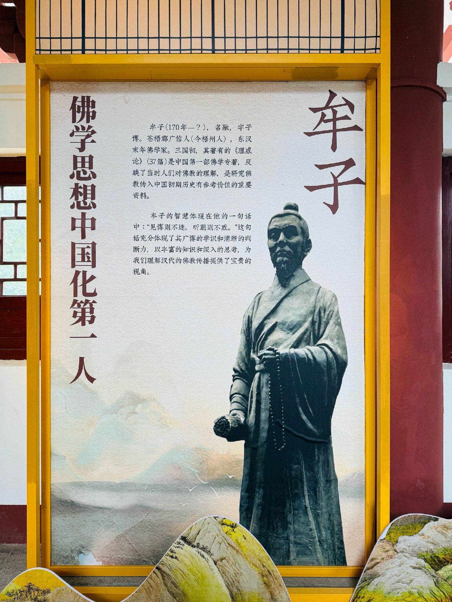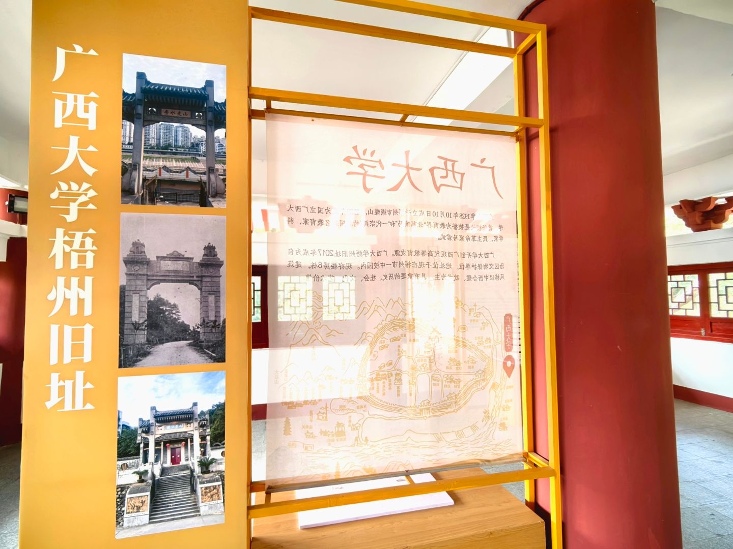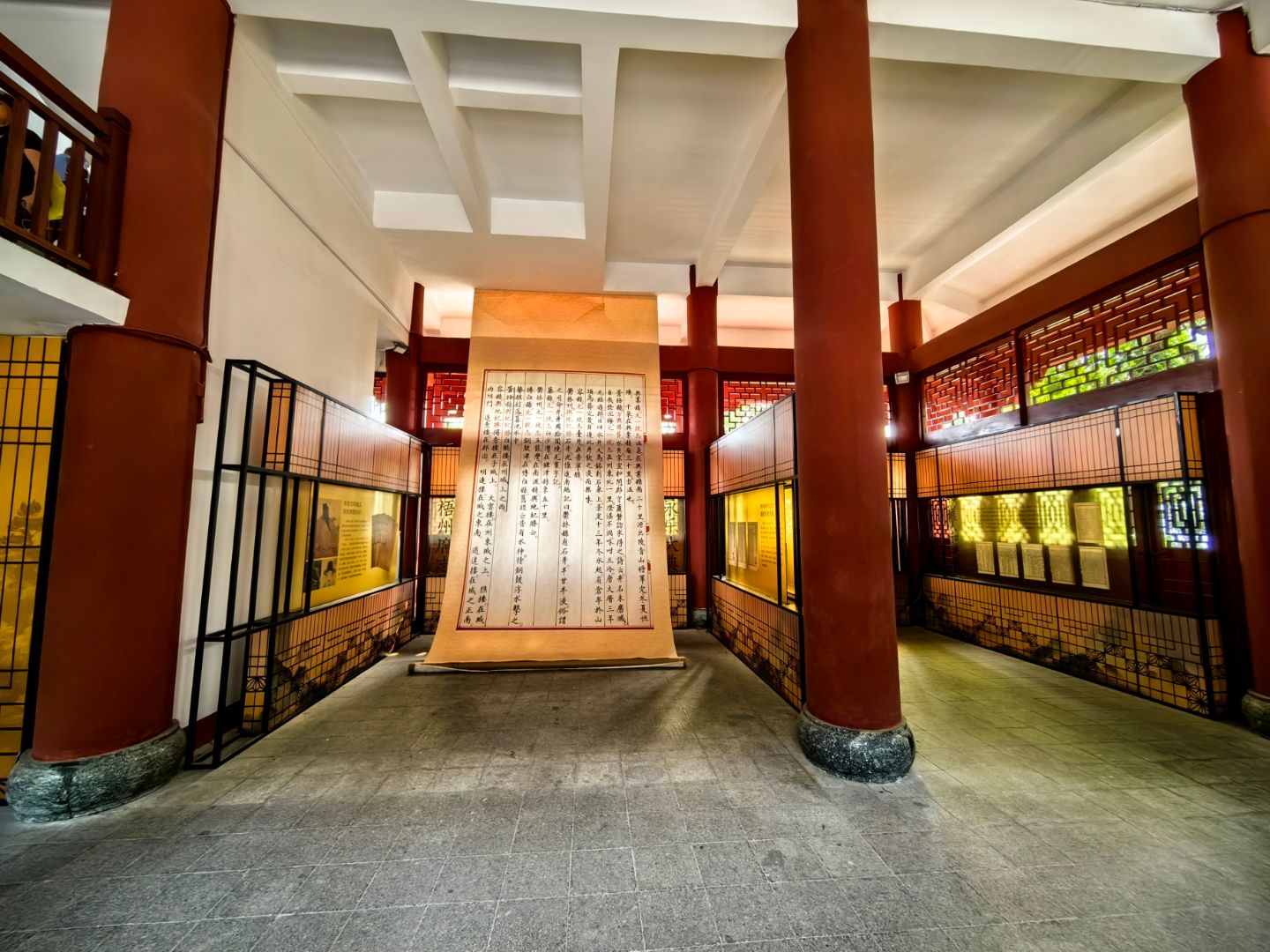 楼高五层,通高二十一米六,广地三百余平。制式纯取岭南古建法度,木石相构,体势端严。朱檐悬铃,风至而清音盈谷;飞檐凌空,势出而气接云天。楼之两翼环以游廊,廊间精镌梧州古八景石刻,鹤冈返照、鸳江春泛、火山夕焰、龙母回春诸胜,次第分列,蔚为大观。一景一碑,碑碑凝韵,刀笔苍劲,尽绘苍梧山水之灵秀,纪录古郡文脉之绵长。循阶缓步而上,层层皆有佳趣,四壁诗画骈罗,书香盈阁。凭窗骋目,仰观千树古木参天叠翠,俯听两岸江涛拍岸回环,近望城郭烟火井然如画。及至顶层周廊,凭栏极目:河东老城骑楼栉比连片,古韵盎然;浔桂二水一清一浊,汇作鸳江天然奇观;西望西江浩浩汤汤,百舸争流,埠岸繁忙,令人目不暇接。当此之时,天光水色,浑然一体,胸中块垒,荡涤无存。方知“江山如画”非虚言,而“心旷神怡”乃实情也。