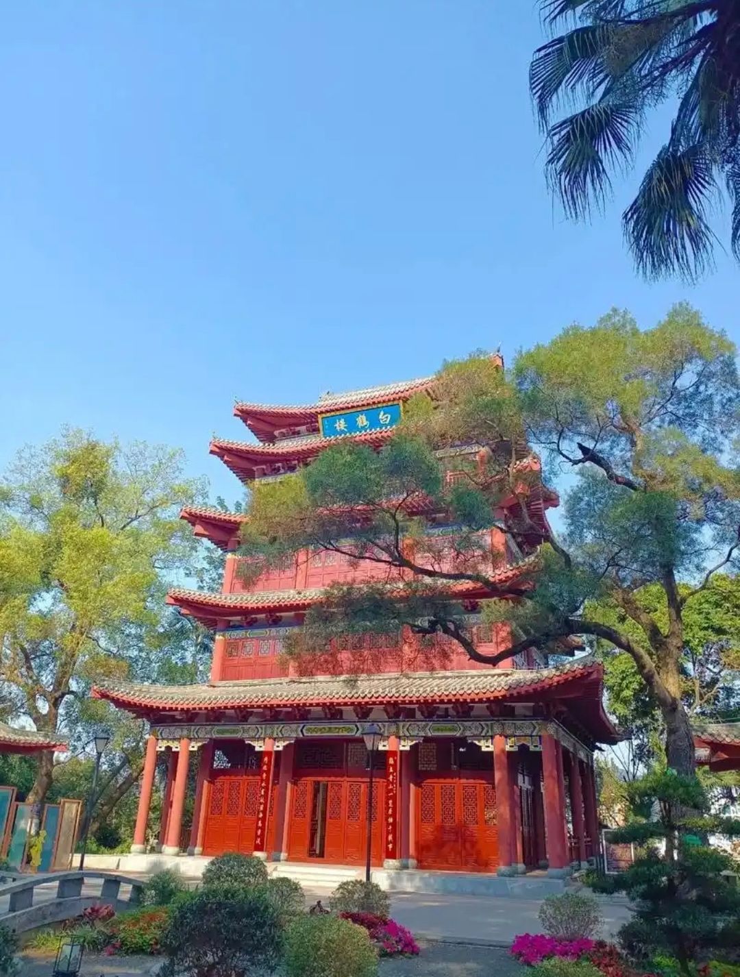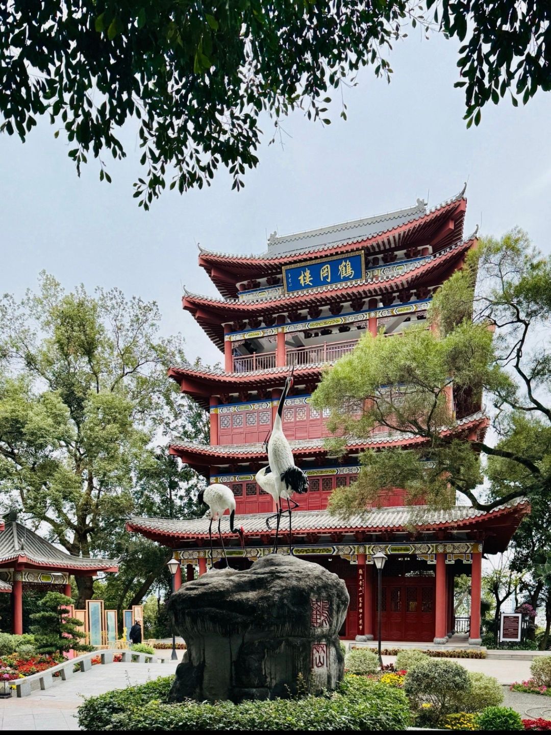 楼名缘起,有据可稽。《舆地纪胜》《名胜志》并载:“梧州城西桂江岸形如飞鹤,山多松,入夜白鹤群鹤集”。山因鹤名鹤冈,楼因山名白鹤,古今沿袭,未尝改易。清代先贤诗存:“城西隔岸叠翠稠,落日平冈见鹤飞。”描摹暮山返照、鹤栖林麓之实景,为历代题咏此楼佳句。今世虽无群鹤归栖旧景,然高楼镇冈,江天同碧;朝迎旭光铺野,暮收夕照归山,山势如鹤入丹青,楼境清幽涵古韵,悠然不减古昔风情。