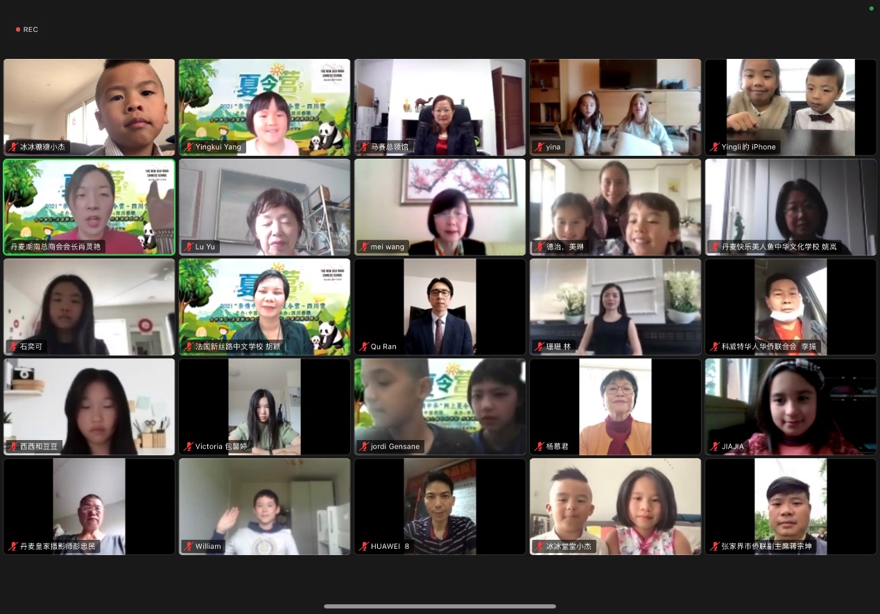 为帮助广大海外华裔青少年在疫情期间继续学习中文、了解中国国情和中华文化,2021年4月26日至5月10日,由中国侨联主办,四川侨联承办,法国新丝路中文学校和丹麦湖南总商会共同协办的“亲情中华·为你讲故事”网上夏令营第二期四川营圆满闭幕。来自法国和丹麦的58名海外华裔青少年参加本期网上夏令营,他们通过网络这样一种特殊形式参加了为期15天的夏令营,相聚云端,学习和感受博大精深的中华文化。5月15日,通过Zoom云端视频会议隆重举行了颁奖典礼。中国驻马赛总领事馆陆慧英总领事和姜峰领事,中国驻丹麦大使馆办公室屈冉主任、陈兵领事,法国巴冀市副市长乔治.瓜佳先生,法国佩皮尼昂市文化主管西西里.瑟马汉女士,四川省侨联唐珊女士,法国新丝路中文学校校长胡颖和名誉校长王玫,丹中融合爱心家园杨慕君会长,丹麦华人总会中文学校副校长俞露等来自法国、丹麦、西班牙、乌克兰、科威特和中国等20多名兄弟学校校长、协会会长以及20余名家长和营员代表等应邀出席。