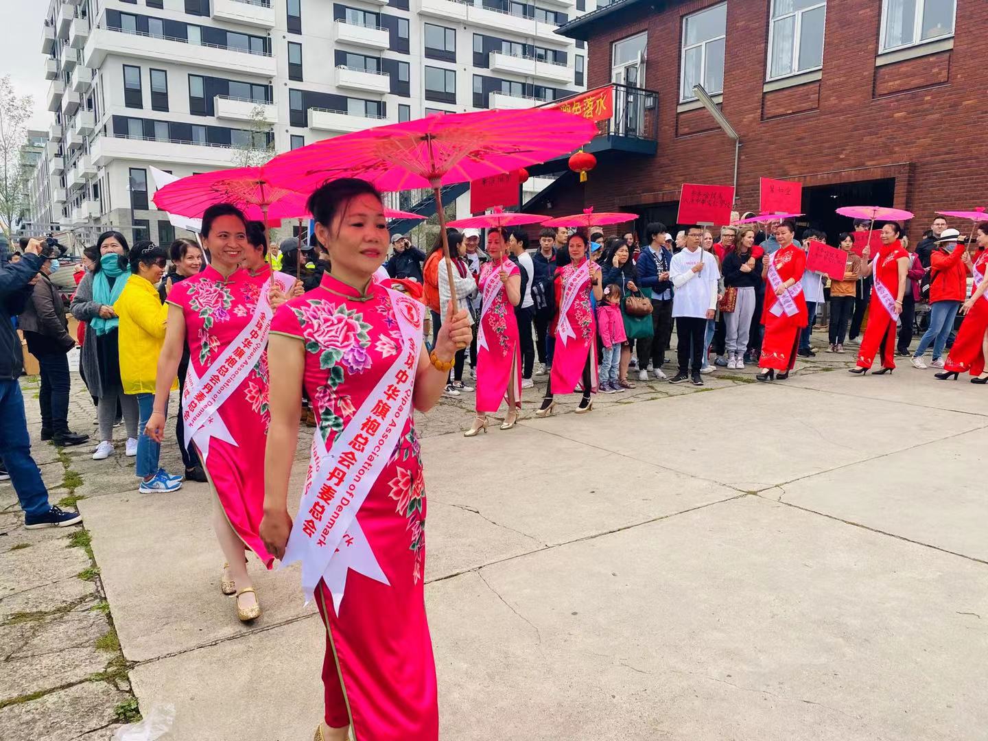 隨着狮子的舞动,丹麦华人总会妇女会的腰鼓队来了,绿色的服装搭配红色的腰鼓,给人一种飒爽英姿的感觉。