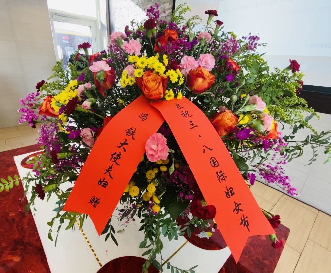 中国驻丹麦大使馆大使冯铁夫妇虽然不能亲自参加庆典活动,却送上了色彩鲜艳的大花篮,更为“宮殿”增添风采。