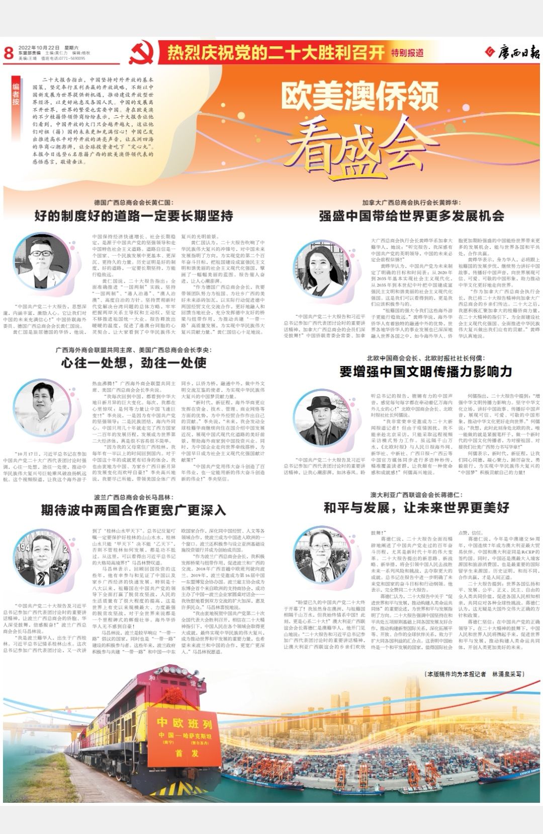 二十大报告指出,中国坚持对外开放的基本国策,坚定奉行互利共赢的开放战略,不断以中国新发展为世界提供新机遇,推动建设开放型世界经济,以更好地惠及各国人民。中国的发展离不开世界,世界的繁荣也需要中国。身在欧美澳的不少侨领侨商纷纷表示,二十大报告让他们看到,中国开放的大门只会越开越大,这让他们对祖(籍)国的未来更加充满信心!中国已发出推进高水平对外开放的洪亮声音,让五洲四海的华商心潮澎湃,让全球投资者吃下“定心丸”。广西日报今日选登6名原籍广西的欧美澳侨领代表的感悟感言,敬请垂注。