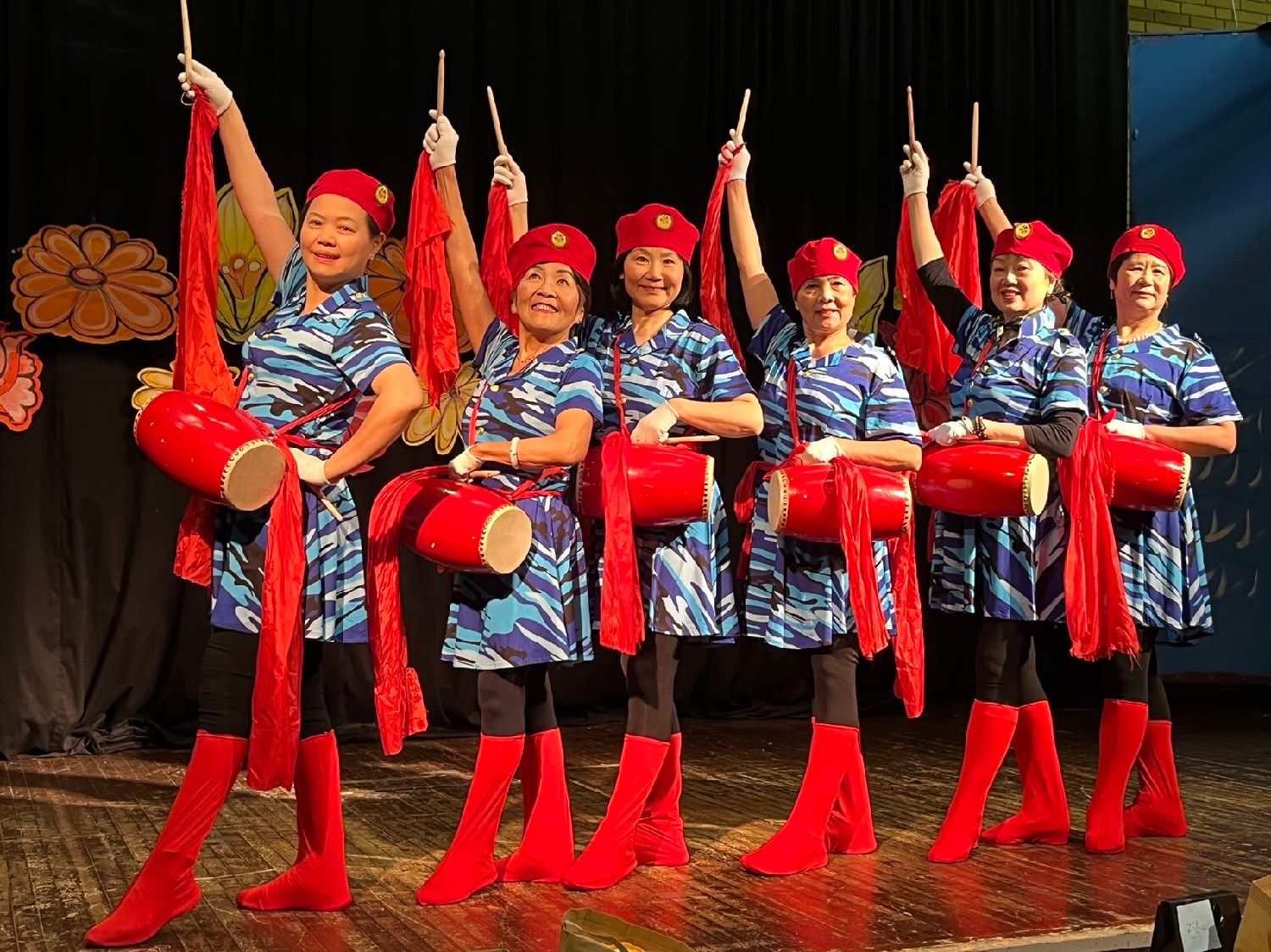 感谢舞蹈队的姐妹们在队长阿兰的带领下,放弃休息进行排练,感谢常委磨红玲虽然回到中国,但依然心系舞队,隔空指导。感谢常委梁美德重捡“大地飞歌”,将新老演员揉合在一起,再显风采。