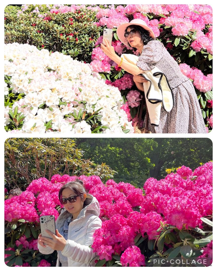 5月9日11时太阳已经露出了笑脸,迎接着大家的到来,走进公园一棵棵色彩各异、高矮错落的杜鹃花立刻映入眼帘,伴随着阵阵清香,令人着迷。杜鹃花红的像火,白的像雪,粉的像刚出生的娃娃脸……大家在花丛中喝了阿岚和Claus夫妇亲手泡制的咖啡,吃了阿芬亲自买的甜品。大家在甜蜜中走进了杜鹃花海。到那儿已挤满了来自各地的游客。