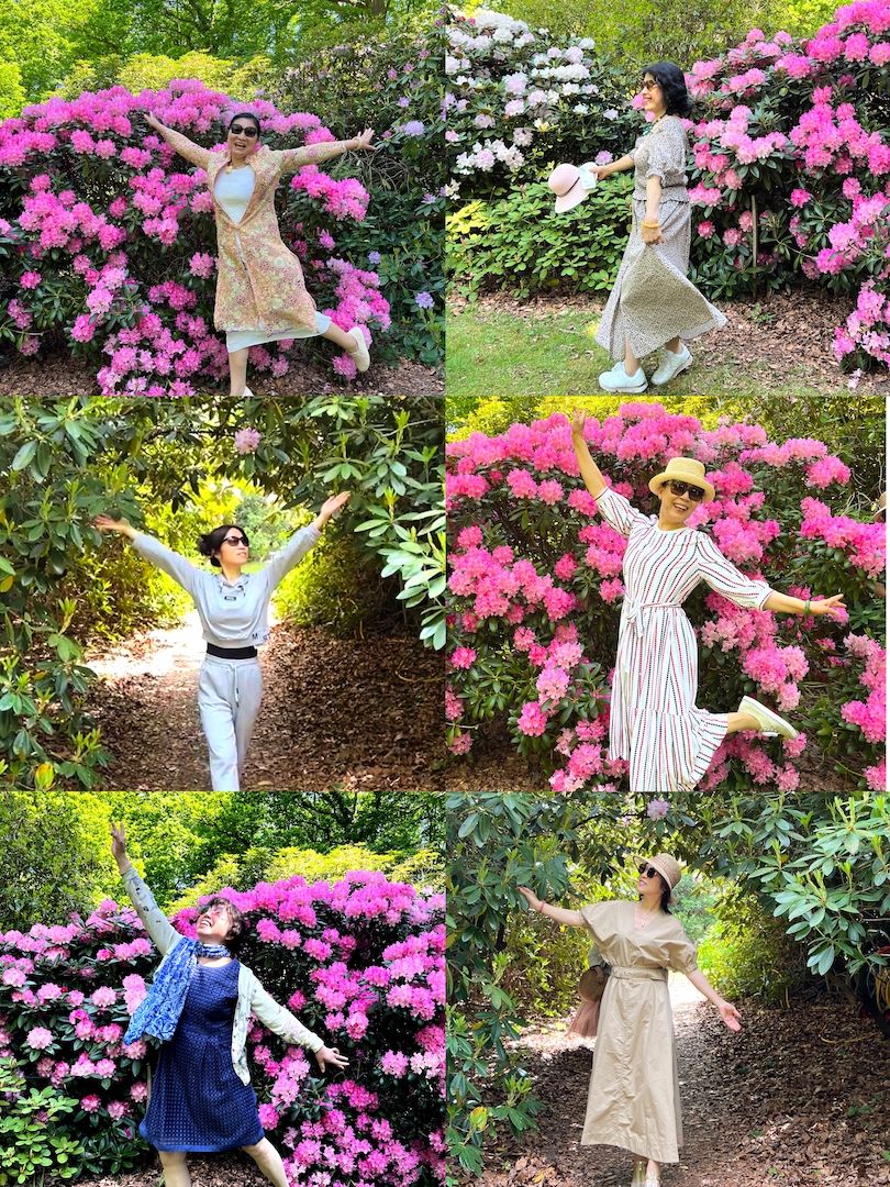 华人摄影爱好者协会的会员们更是迫不及待地游入了花海,开始拍摄,摄影师们边拍边研究着摄影、摄像角度、光线和表情,大家瞬间变化着各种角色:摄影师、模特儿、演员……有的在花丛中走秀、有的在花丛中舞蹈,有的在花丛中蹦哒,有的在花丛中自拍。大家快乐得像蝴蝶般地飞翔在花丛中,像小姑娘般的天真可爱。丹麦人Claus在杜鹃花丛中为大家介绍各种不同品种的杜鹃花,为我们上了一堂现场生物课。