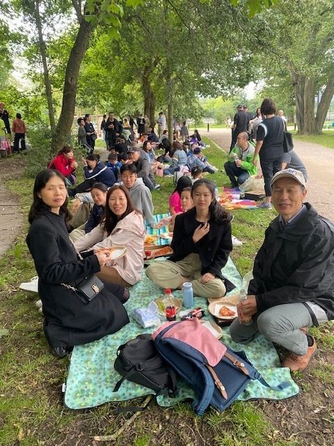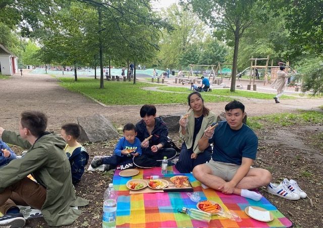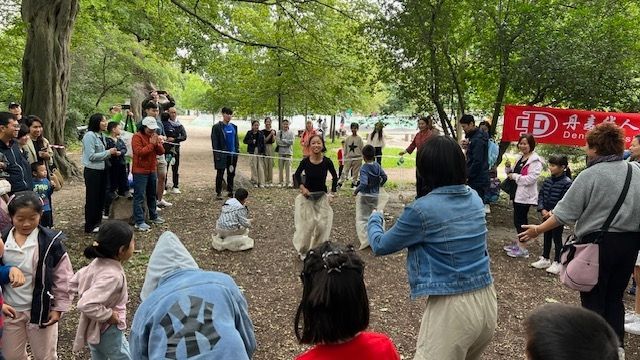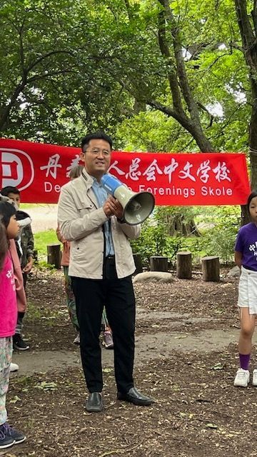 不一会儿大家陆续来到了我们举办活动的场地,在绿树丛中鲜红的“丹麦华人总会中文学校”的校旗悬挂在两棵树间,校旗鲜艳夺目,中丹两国国旗在路边隨风飘扬。在音乐声中家长们、孩子们来了,也将欢声笑语带到了现场。老师们、总会常委们忙碌着,家长们敞谈着,孩子们玩乐着。